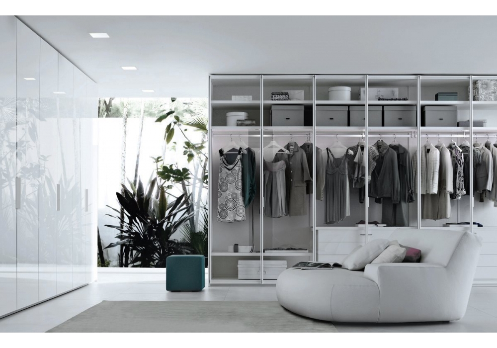 Ego firmata da Giuseppe Bavuso per Poliform è un armadio con ante in vetro e telaio in alluminio. Ego è un armadio leggero e trasparente.