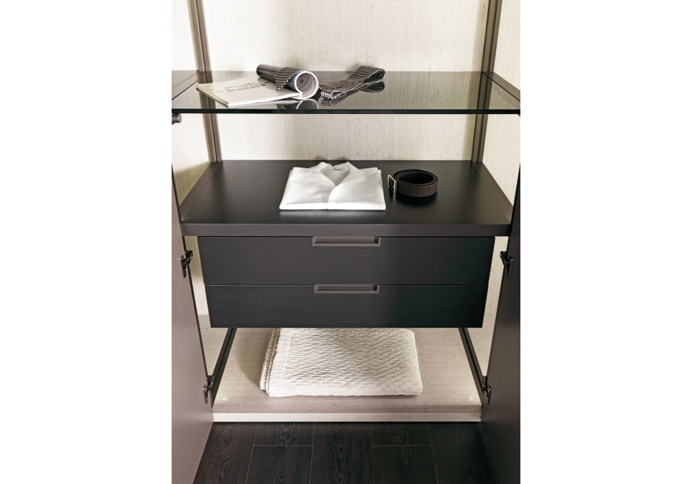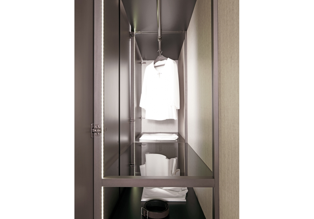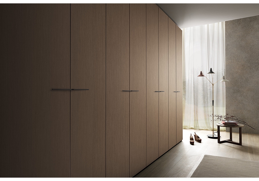 Tecno firmato da MisuraEmme è un armadio con ante a battente, scorrevole o complanare realizzate con pannelli in particelle di legno rivestito con nobilitazione melaminica. Bordo ABS in tinta.