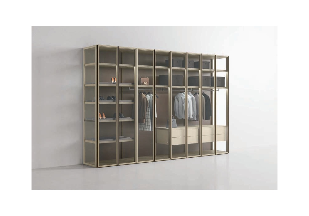 Teatro firmata da Pianca è una cabina armadio. La struttura portante diventa geometria visibile e caratterizzante, discreta cornice per ogni contenuto, perfetta per ogni ambiente e stile. I divisori a telaio passanti, senza pannelli interni, assicurano continuità visiva e spaziale, enfatizzando la leggerezza dell’architettura e dei volumi. La struttura permette il posizionamento della cabina sia a parete, sia a centro stanza. La possibilità di includere schienali e fianchi arricchisce le opportunità di personalizzazione, rendendola perfetta per adattarsi ad ogni stile.