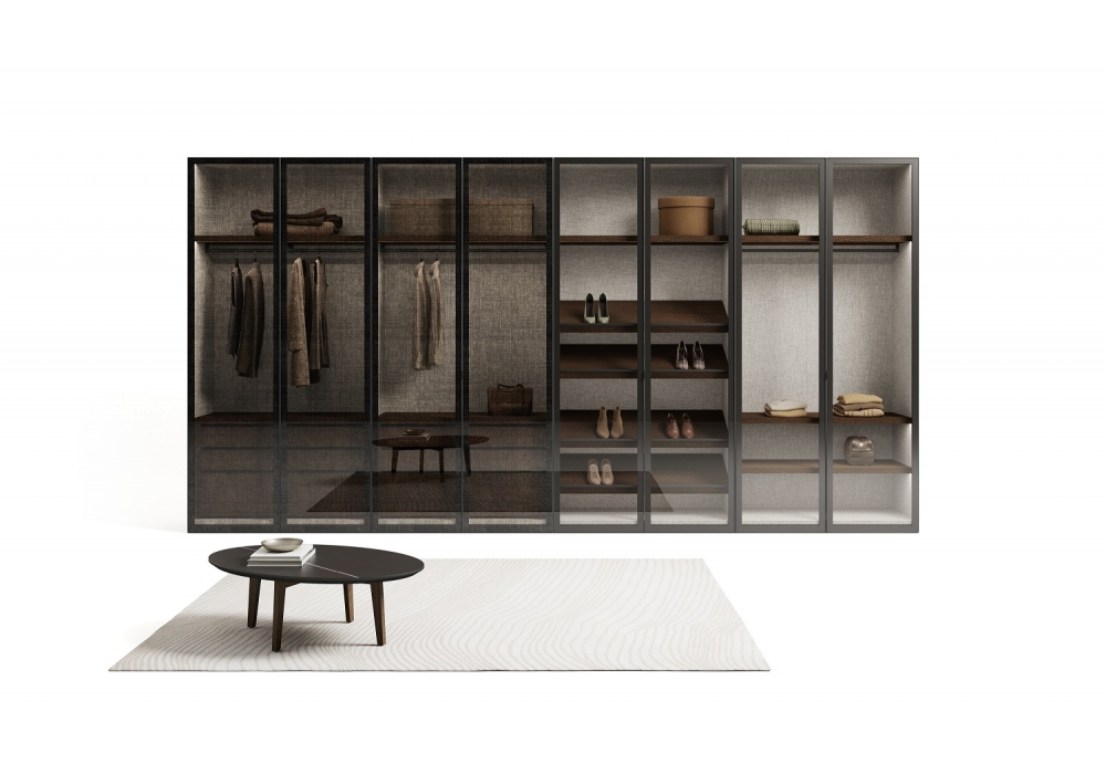 Casio firmato da Dall'Agnese è un armadio con ante battente realizzate con telaio in alluminio verniciato nero, titanio o laccato opaco e vetro temperato trasparente grigio, trasparente bronzo, vetro effetto tessuto oppure specchio. I vetri effetto tessuto vengono ottenuti mediante applicazione di una pellicola adesiva in grado di ricreare un effetto simile al tessuto. Apertura mediante maniglia integrata nel telaio.