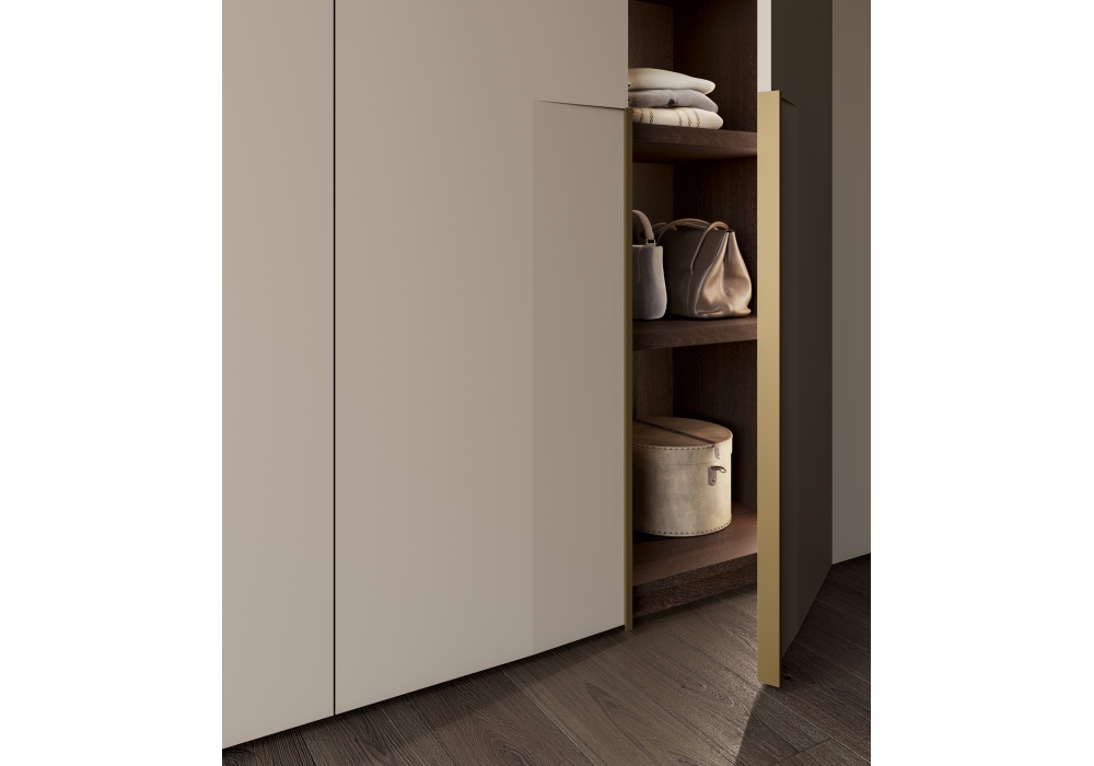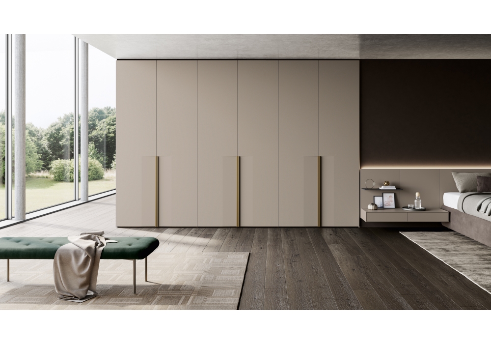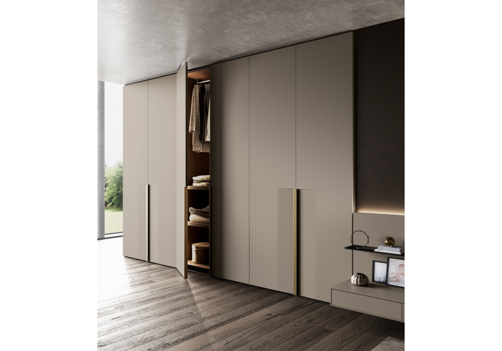Freccia firmato da Dall'Agnese è un armadio con ante battente realizzate con pannelli in HDF laccati. Apertura mediante maniglia in metallo verniciato.