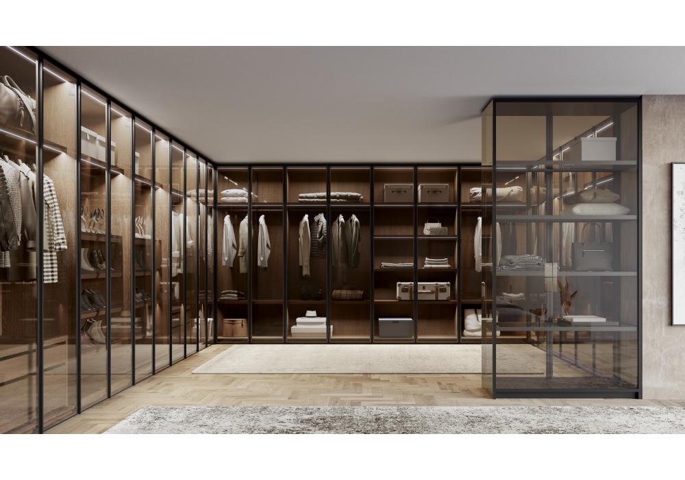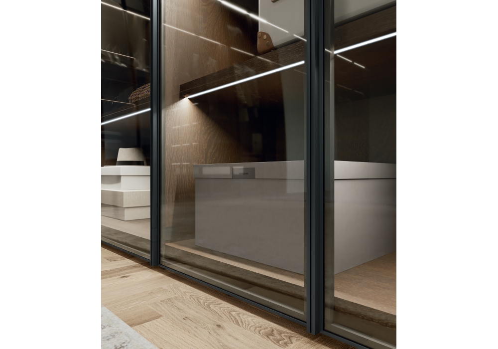 Glass Up firmato da Dall'Agnese è un armadio con ante battente realizzate con telaio in alluminio verniciato e vetro temperato trasparente grigio, trasparente bronzo, vetro tessuto oppure specchio. I vetri effetto tessuto vengono ottenuti mediante applicazione di una pellicola adesiva in grado di ricreare un effetto simile al tessuto. Apertura mediante maniglia in metallo integrata nel telaio.