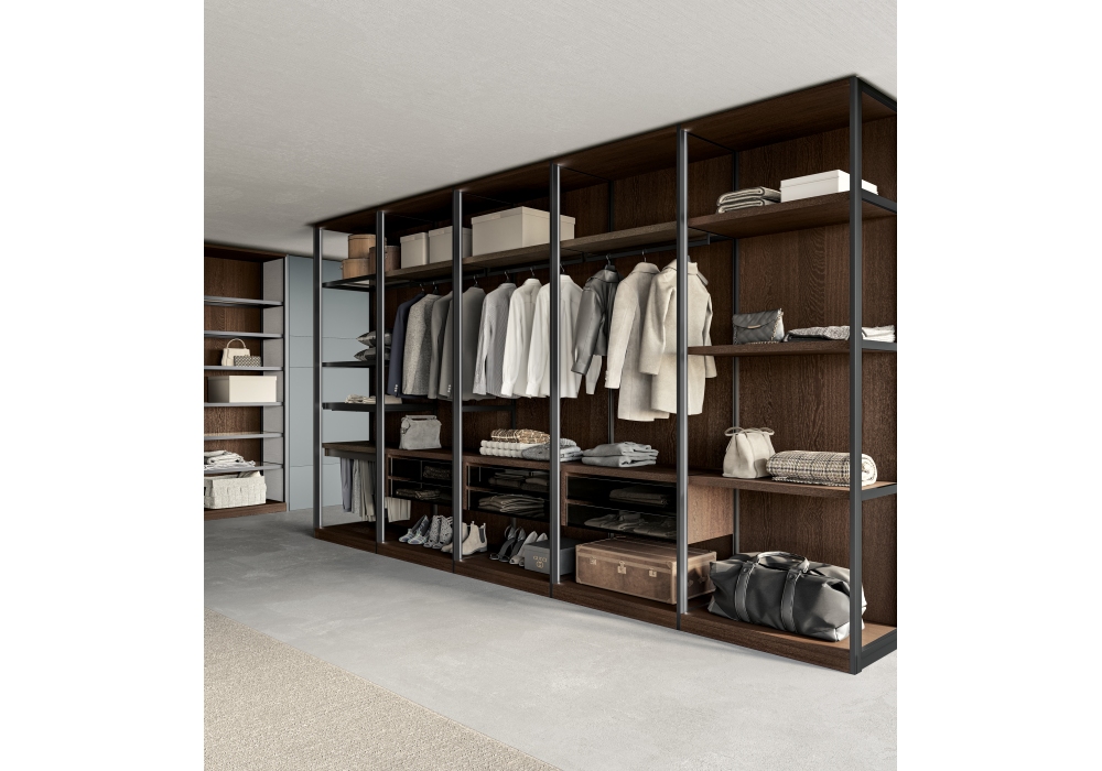 Scena firmata da Dall'Agnese è una cabina armadio realizzata con struttura con pannelli di particelle di legno certificati con nobilitazione melaminica. Telaio in alluminio verniciato nero o titanio, con traversi per il fissaggio di ripiani e attrezzature interne. Zoccolo e piedini regolabili per garantire stabilità e allineamento.