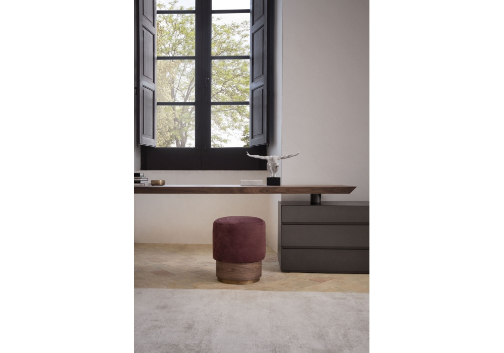Fontana firmato da Joe Garzone per Conte Casa è un pouf realizzato con base circolare in metallo verniciato o ottone brunito, struttura in legno e seduta rivestita in tessuto o in pelle. Disponibie in diverse finiture.