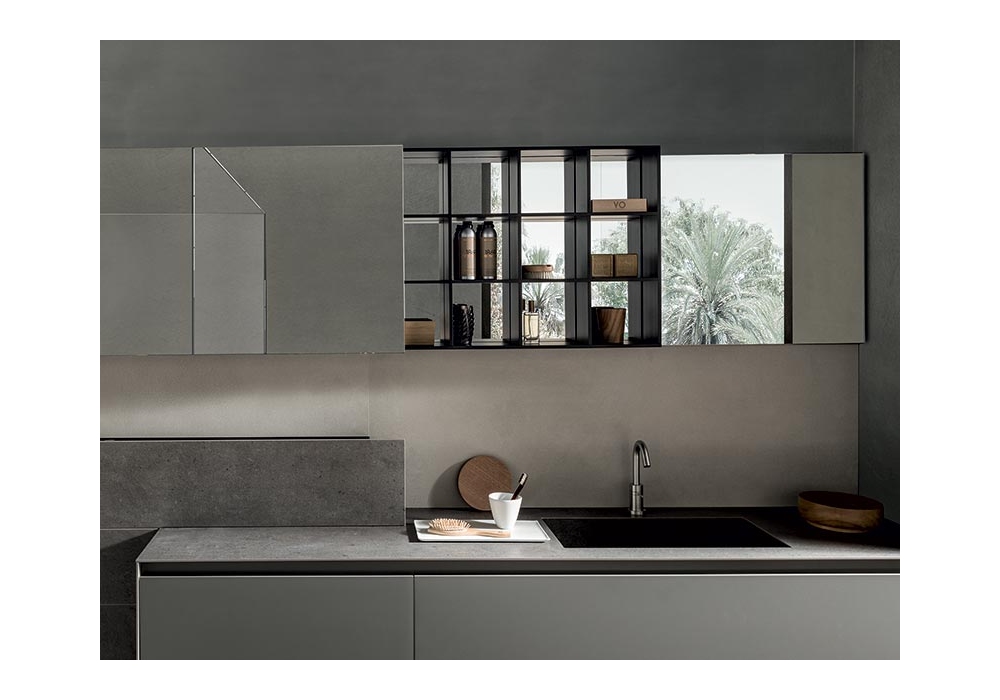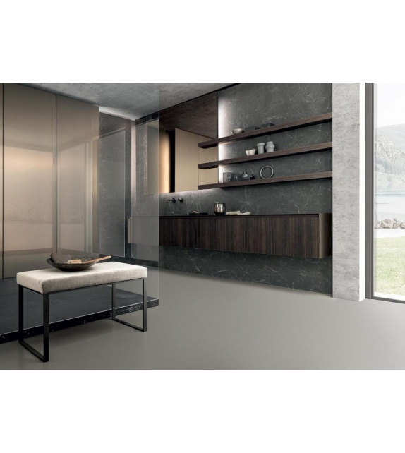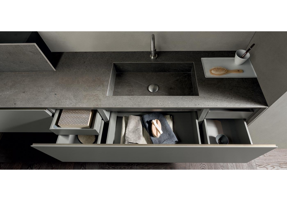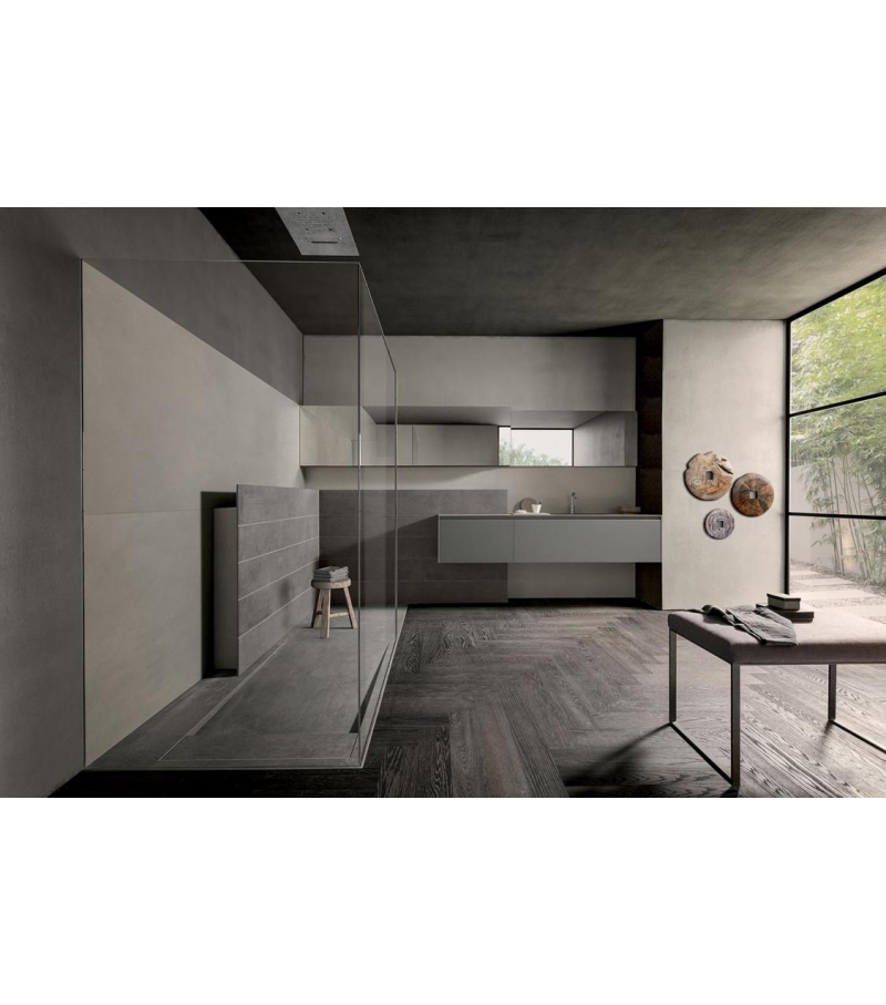 Skill firmato e prodotto da Modulnova è un sistema bagno dalle linee pulite e forme essenziali. Il piano e il lavabo integrato sono realizzati in gresm materiale che riproduce l'effetto della pietra. La specchiera Wall assolve a una duplice funzione, diventando un elemento scorrevole di contenimento per piccoli oggetti. L'elemento Board è composto da pannelli che nascondono contenitori e vani porta accessori. Ogni elemento del sistema Skill può essere realizzato in vari materiali, contatta il nostro Customer Service per configurarlo a tuo piacimento.