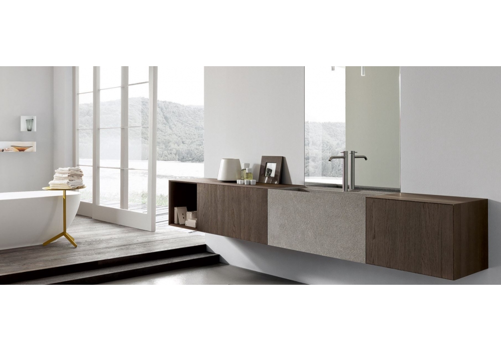 More firmato e prodotto da Modulnova è un sistema bagno con lavorazione in folding delle basi in rovere e lavabo in pietra con bordo a 45°. Il sistema comprende anche una parete in resina retrostante, ma ogni elemento può essere realizzato nei materiali più diversi, con tecniche di lavorazione specifiche che esaltano la qualità della materia prima utilizzata. Contatta il nostro Customer Service per configurare il sistema More come preferisci.