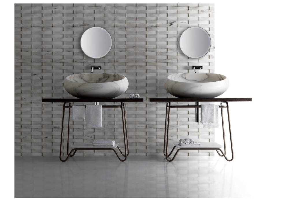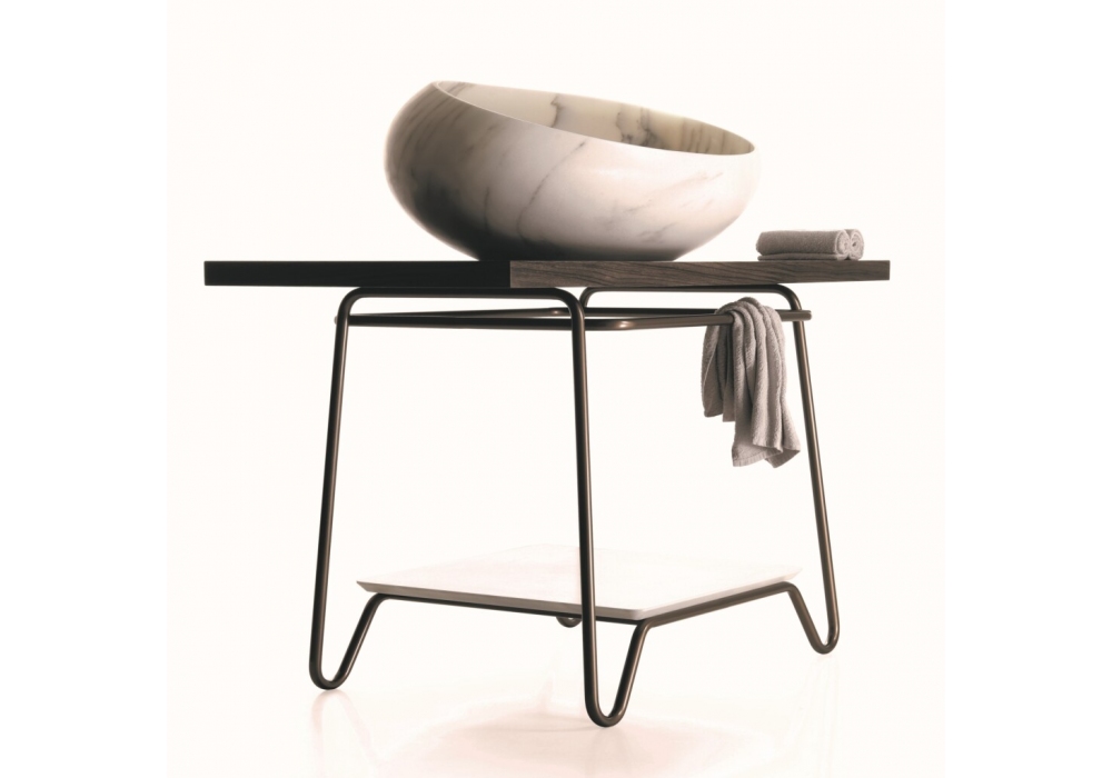 Kato firmato da Enzo Berti per Kreoo è un cavalletto con struttura realizzata da un tondino metallico, piano in marmo o legno in essenza e piano inferiore in diverse finiture di marmo. Integra nel disegno della struttura la funzione di porta salviette e diventa un complemento ideale a cui associare i lavabi in marmo da appoggio.