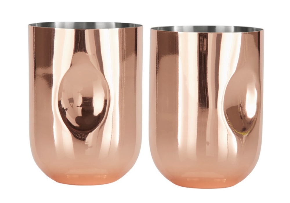 Plum Moscow Mule firmato da Tom Dixon è un set composto da due bicchieri in acciaio massiccio nella finitura rame lucido.