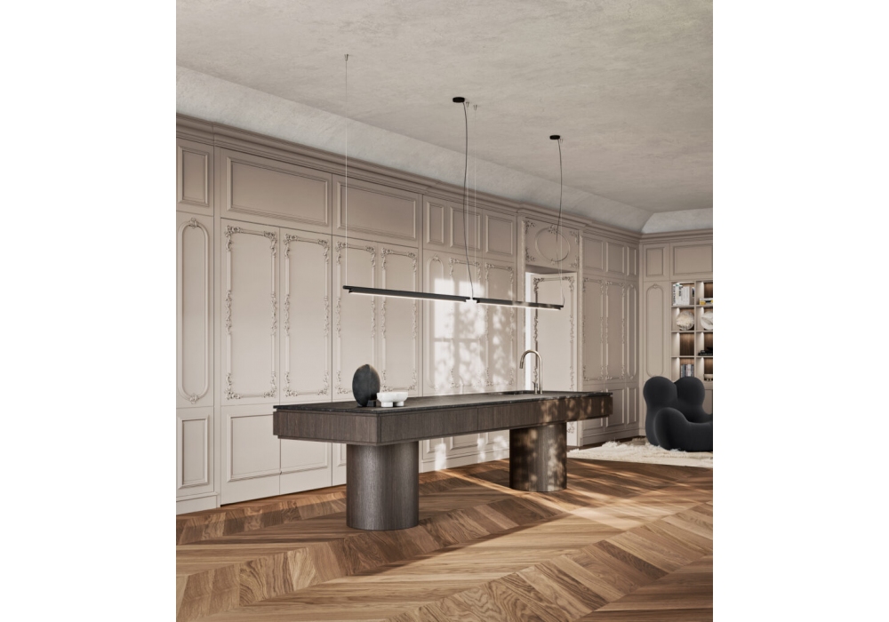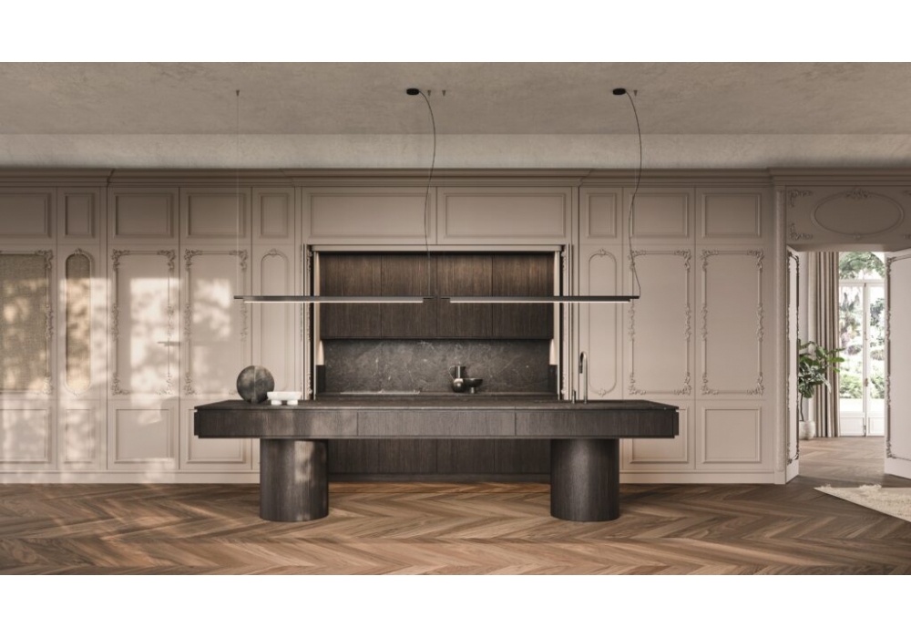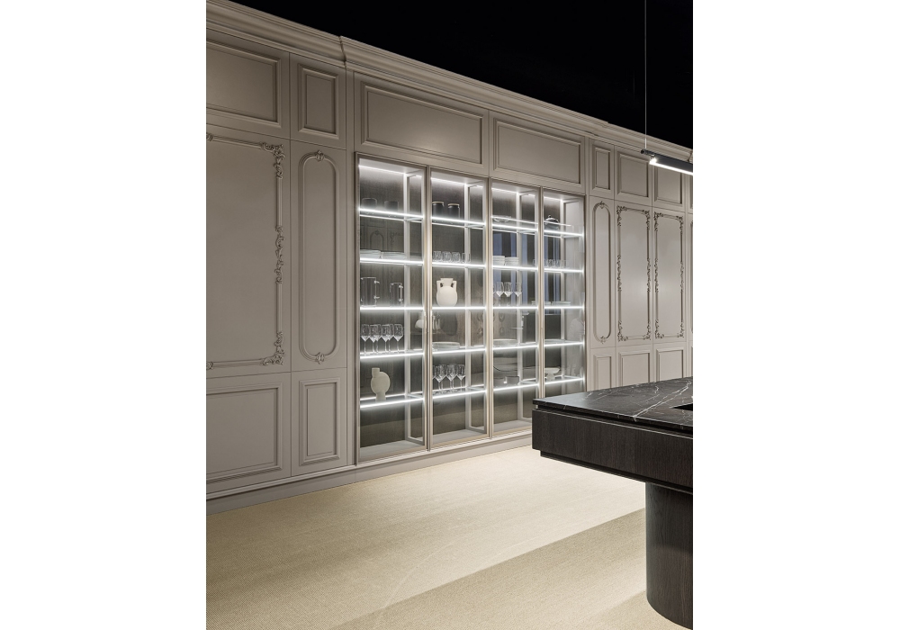 Floral Botanica firmata da makethatstudio per L'Ottocento è una boiserie in legno riveste l’ambiente cucina con un sistema a parete completamente attrezzato e versatile. Si struttura in maniera personalizzata, con ante rientranti o estraibili, mensole e vani aperti o chiusi, in base alle esigenze e alla destinazione degli spazi. Può comprendere anche le porte di passaggio, che si integrano così nella boiserie.
