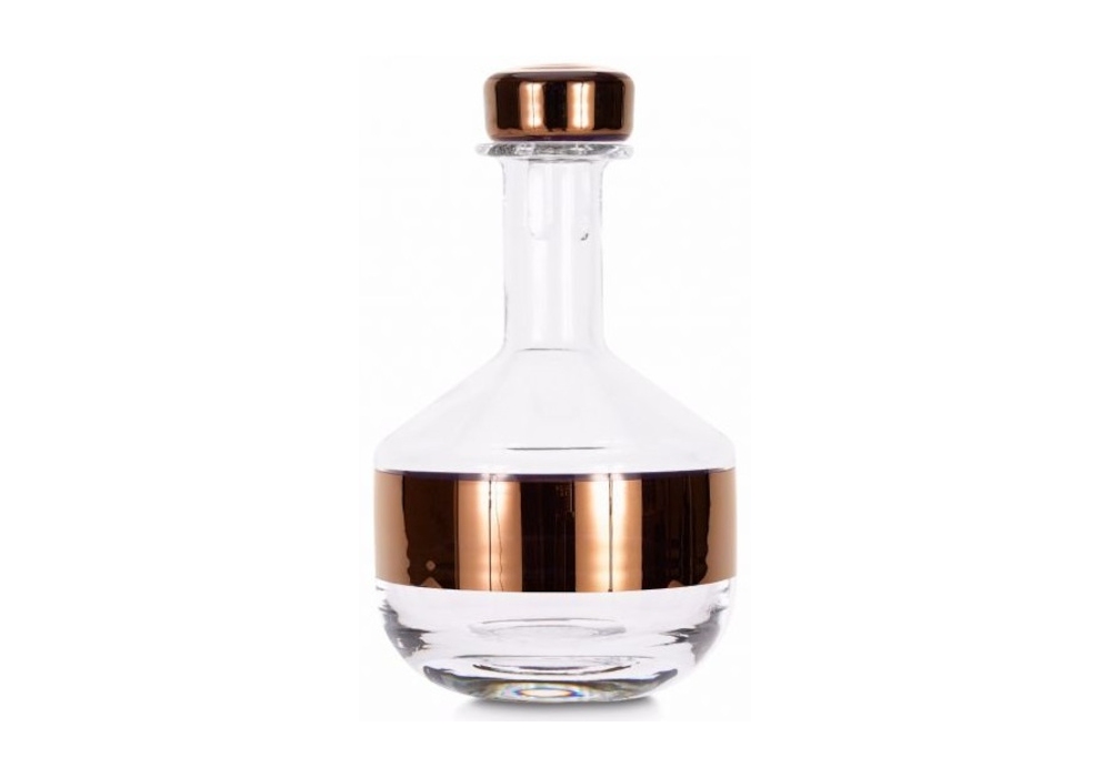 Tank Whiskey firmato da Tom Dixon è un decanter realizzato in vetro soffiato trasparente, dettagli disponibili nelle finiture rame o nero.