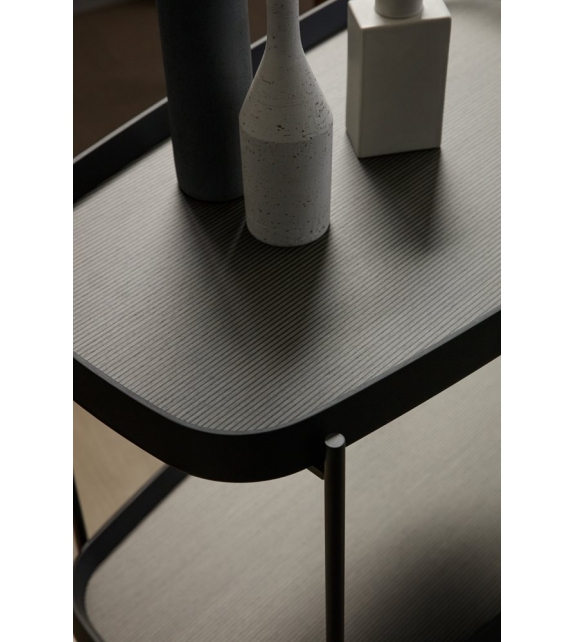Jet firmato da Carlo Ballabio per Porada è un carrello di servizio con base in metallo nero opaco e piani in legno con cornice in massello di noce canaletta. L'interno dei piani può essere in noce canaletta, laccato brillante oppure con lavorazione ad intarsio microrighe. Disponibile in diversi modelli.