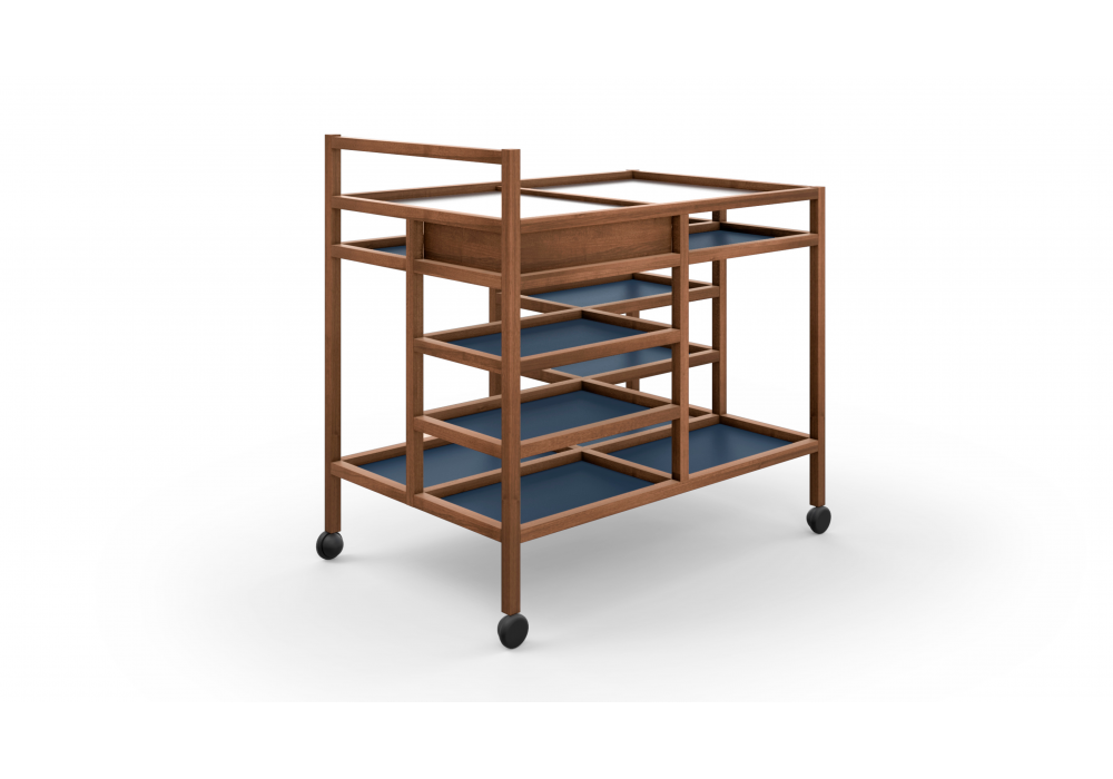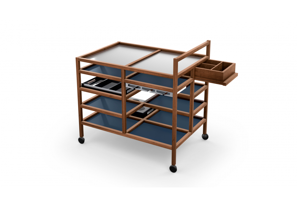 657 Serving Cart firmato da Bodil Kjær per Cassina è un carrello di servizio con ruote con ripiani inferiori in HPL laminato e struttura in legno massello. I ripiani superiori e gli accessori sono sempre in acciaio inox spazzolato.