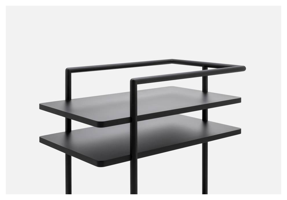 Aero T firmato da Shibuleru per Living Divani è un carrello che si caratterizza da due ripiani ed un contenitore a giorno racchiusi in una struttura metallica in finitura nero opaco. Ruote piroettanti rivestite in gomma. I ripiani sono in MDF finiti con cornice antigraffio e contenitore a giorno composto da un piano in MDF e cornice in HPL rivestito in pelle nera e fissato al piano. Fianchi interni, bordi e fondo del vassoio sono realizzati in varie finiture.