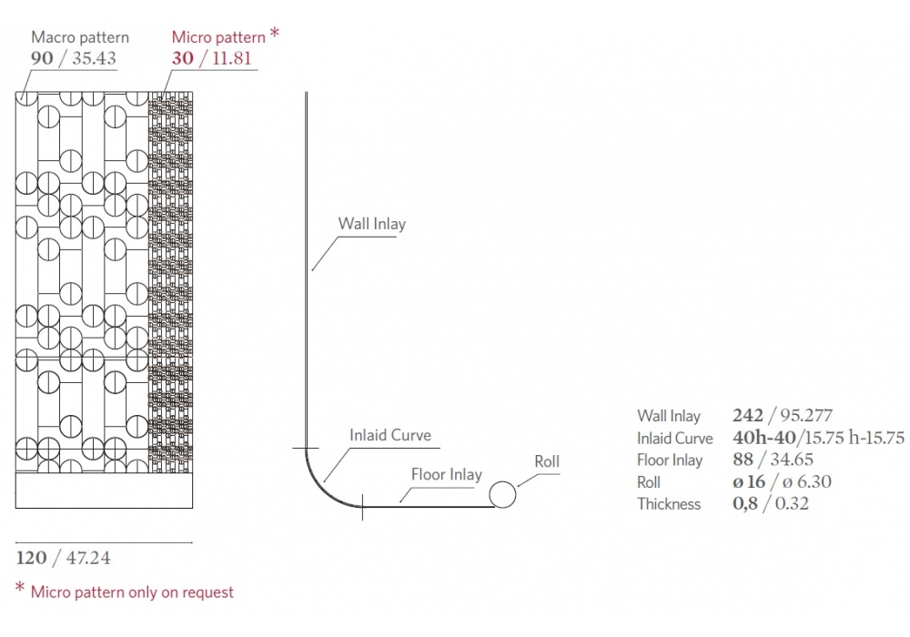 Ballon firmata da Patricia Urquiola per Budri è una carta da parati composta da intarsio a parete, elemento curvo, e pavimento. Rotolo di marmo in Bianco Lasa completa la realizzazione. Micro pattern solo su richiesta.