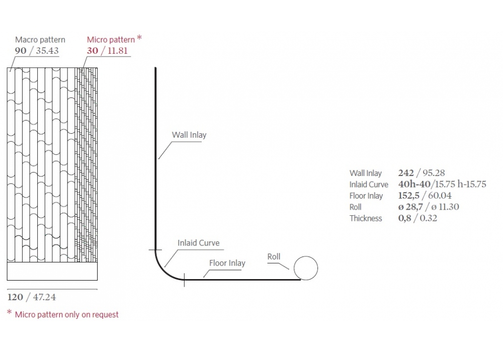 Biscuit firmata da Patricia Urquiola per Budri è una carta da parati composta da intarsio a parete, elemento curvo, e pavimento. Rotolo di marmo Rosa del Portogallo completa la realizzazione. Micro pattern solo su richiesta.