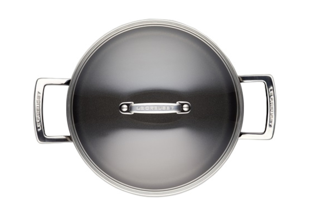 Pentola con Manici e Coperchio 24 disegnata da Le Creuset è una pentola in alluminio antiaderente con coperchio in vetro.