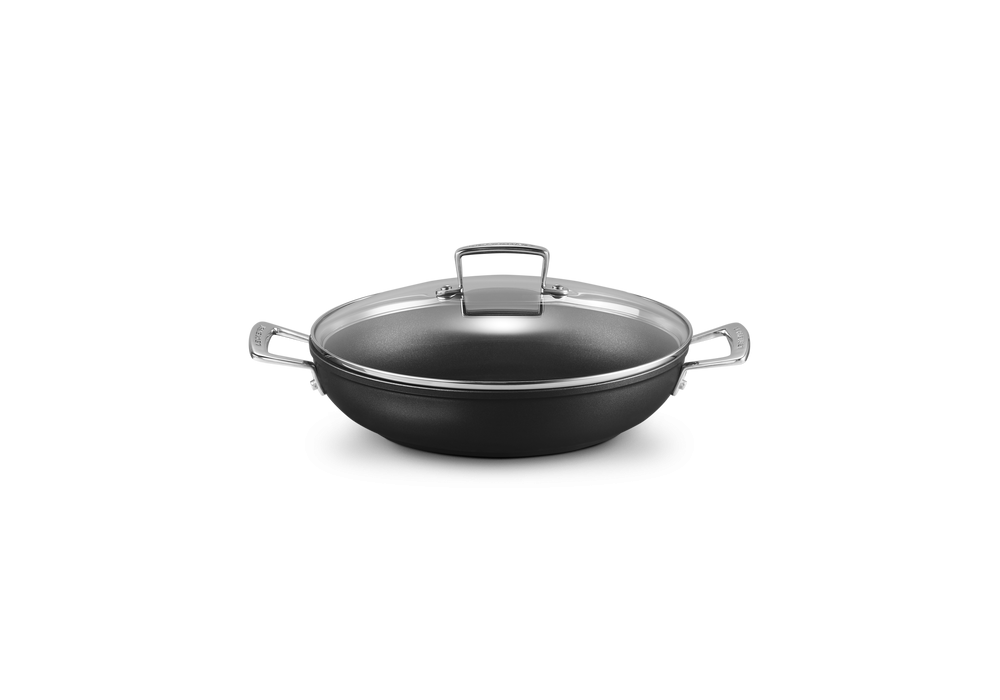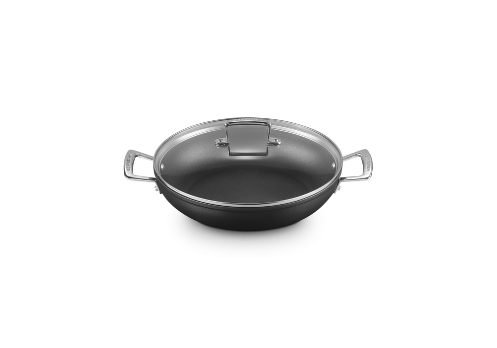 Tegame Basso con Manici e Coperchio 30 disegnata da Le Creuset è una casseruola in alluminio antiaderente con manici e coperchio.