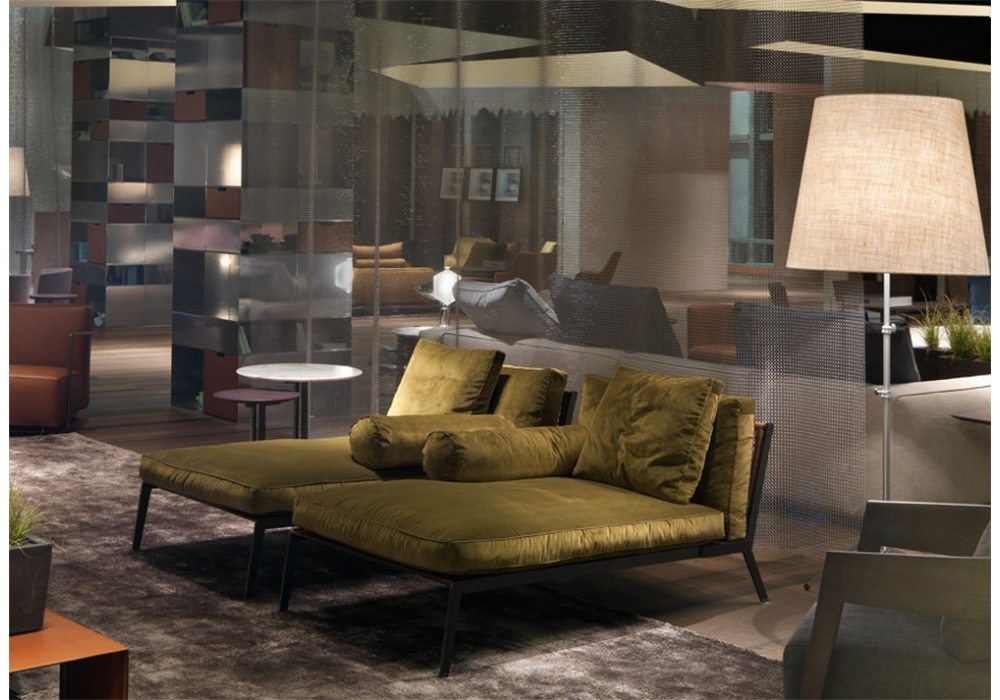 Happy è una chaiselongue disegnata da Antonio Citterio per Flexform. Telaio seduta in metallo rivestito in cuoio con materassino in dacron. Schienale in metallo e cordoncino di cuoio intrecciato. Cuscino seduta in piuma con supporto interno in materiale indeformabile. Cuscini schienale in piuma.a richiesta con supplemento di prezzo cuscinetti in piuma. Rullo bracciolo in piuma stabilizzato da un inserto in metallo. Rivestimento sfoderabili in tessuto o pelle.