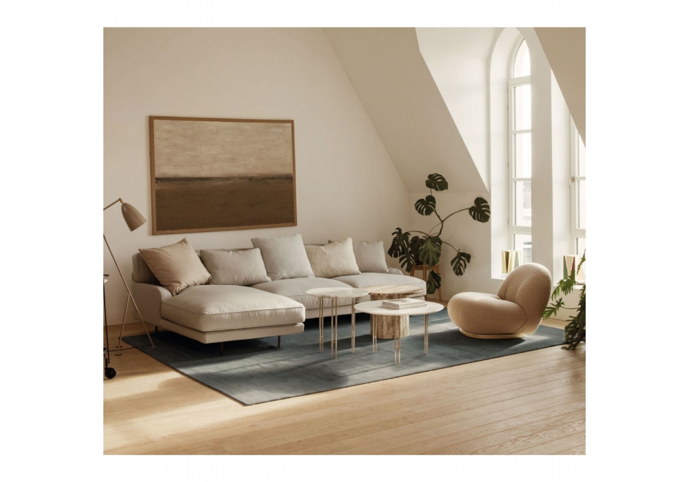 Flaneur firmata da GamFratesi per Gubi è una chaise longue disponibile con rivestimento in tessuto o pelle e base verniciata nera opaca o ottone anticato.
