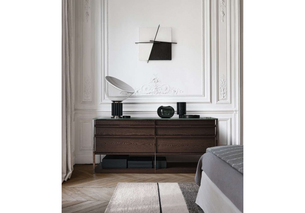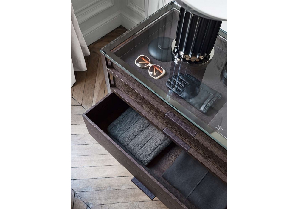 Lithos firmata da Antonio Citterio per Maxalto è una cassetiera con struttura in acciaio verniciato; vassoi estraibili in rovere in differenti finiture, con fondo rivestito in pelle. Piano in vetro extralight trasparente. Disponibile in diversi modelli.