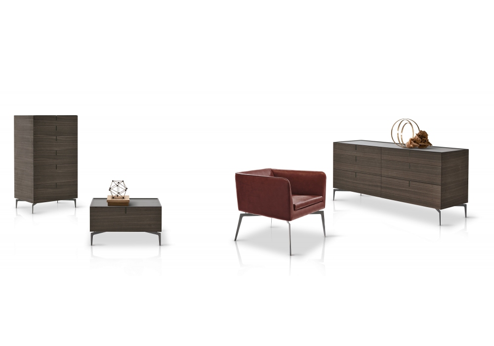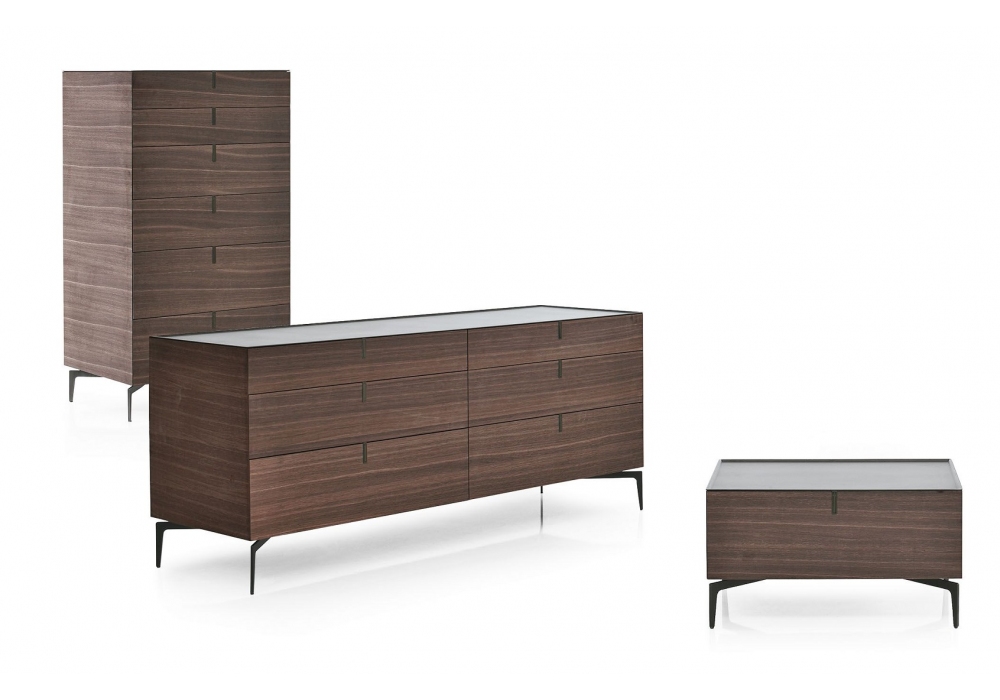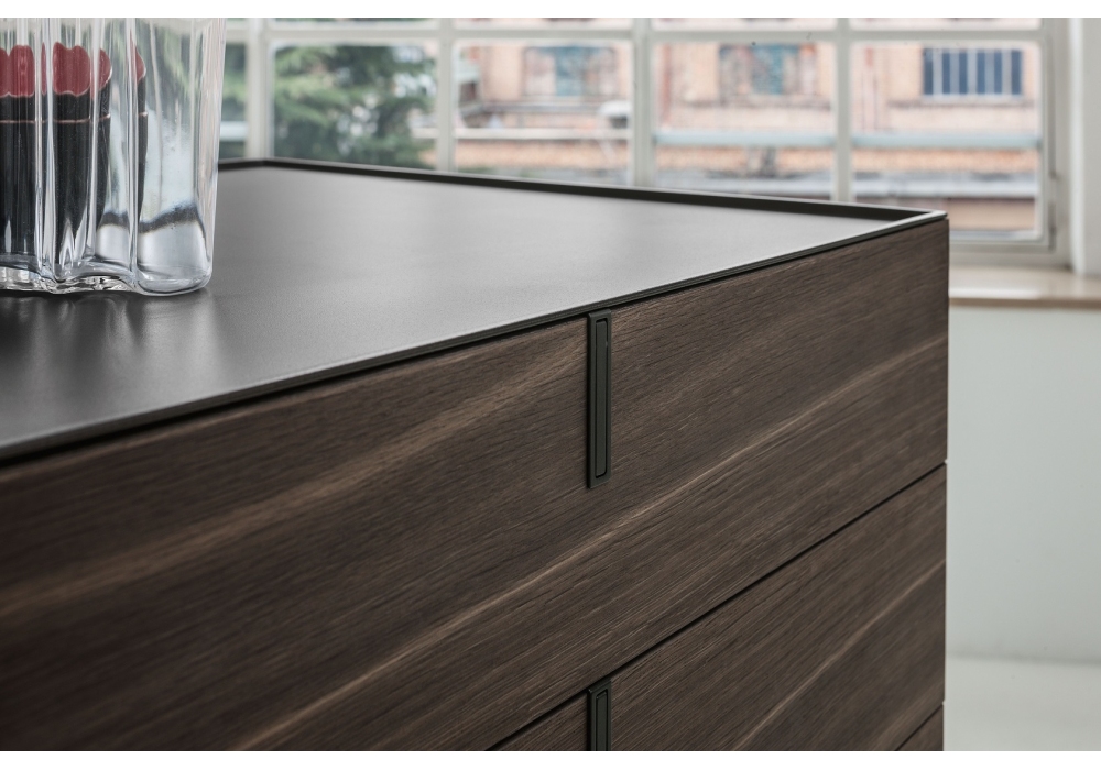 Meridien firmato da Giuseppe Bavuso per Alivar è un comò realizzato con struttura in MDF laccato opaco o in rovere verniciato o termotrattato. Cassetti con guide metalliche frenanti. Frontale in MDF laccato opaco o in rovere verniciato o termotrattato. Maniglie in metallo. Top e base in acciaio verniciato.