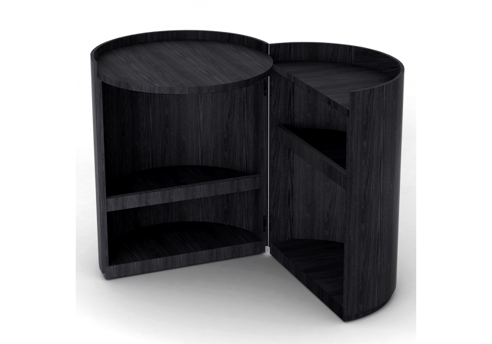 Moon firmato da Mist-o per Living Divani è un comodino composto da due semi-cilindri in multistrati curvato spessore 7mm in rovere naturale o tinto carbone, finitura con vernice acrilica ad acqua. Base, ripiani interni e top in MDF spessore 15mm, impiallacciato rovere. Peso stabilizzatore avvitato all’interno della base fissa e piedini in materiale plastico colore nero; parte mobile invece dotata di ruote piroettanti per l’apertura. Le due porzioni sono unite tramite cerniere e la chiusura è garantita da calamite inserite all’interno della struttura portante. Disponibile sia nella versione destra che sinistra.