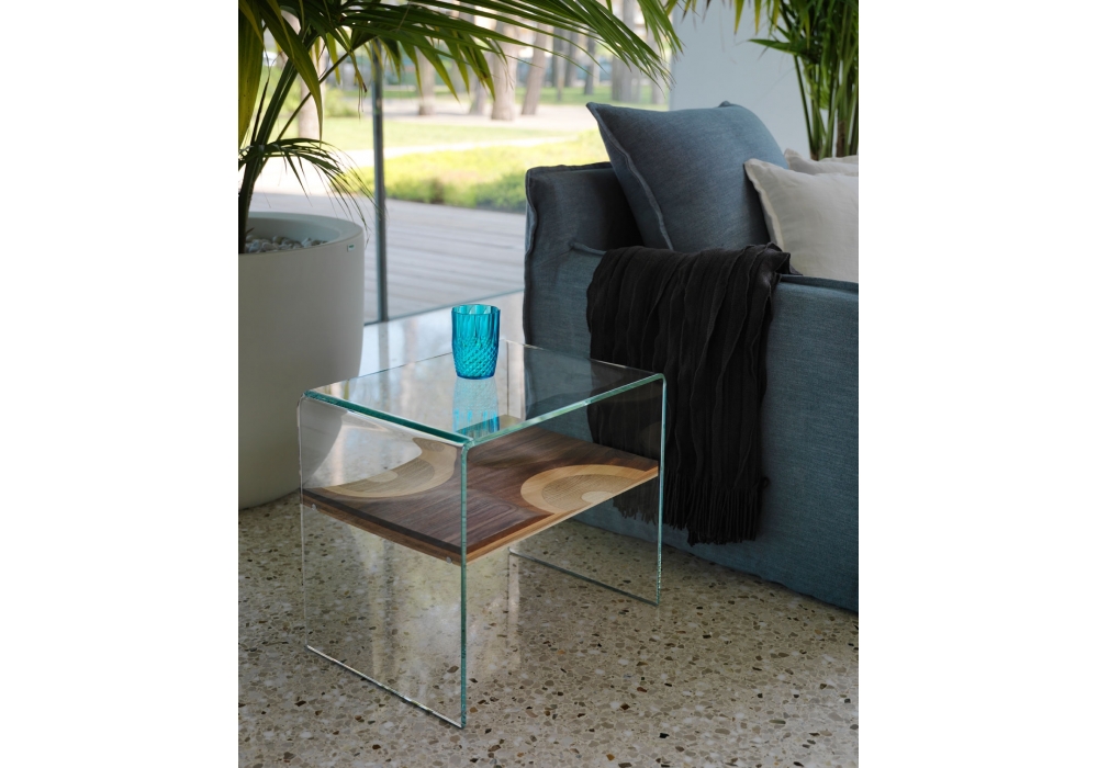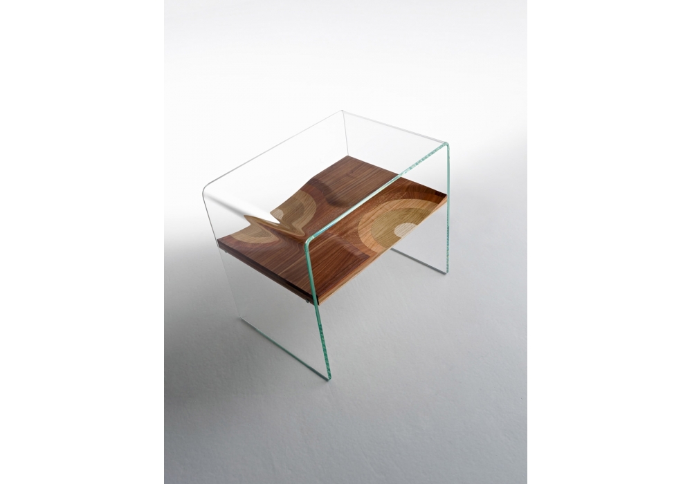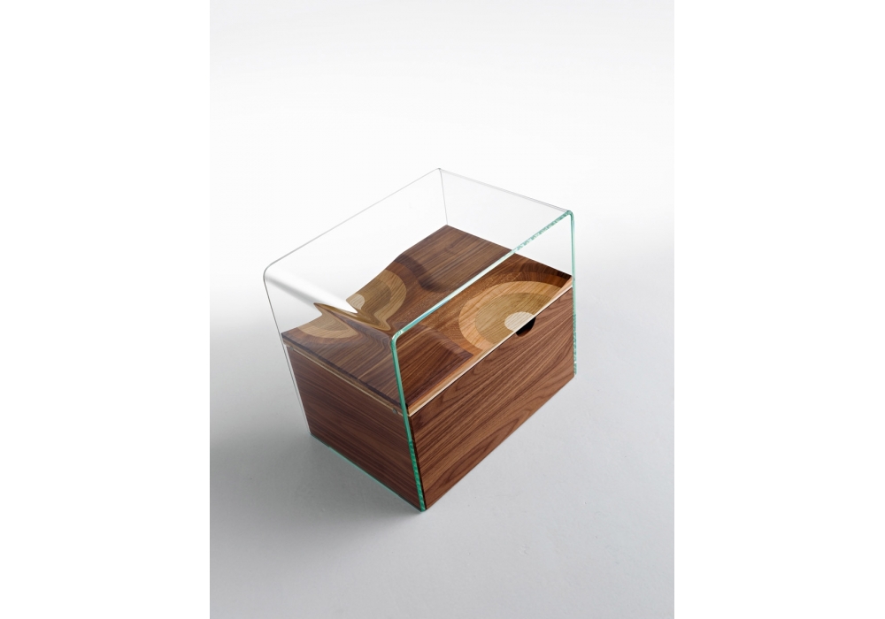 Bifronte firmato da StH per Casamania & Horm è un comodino realizzato con struttura in vetro extra clear curvato. Ripiano in legno massello multistrato in cinque differenti legni (noce canaletto, mogano, ciliegio, rovere e frassino). Cestone scorrevole su ruote, in MDF impiallacciato in noce canaletto con un fronte laccato bianco.