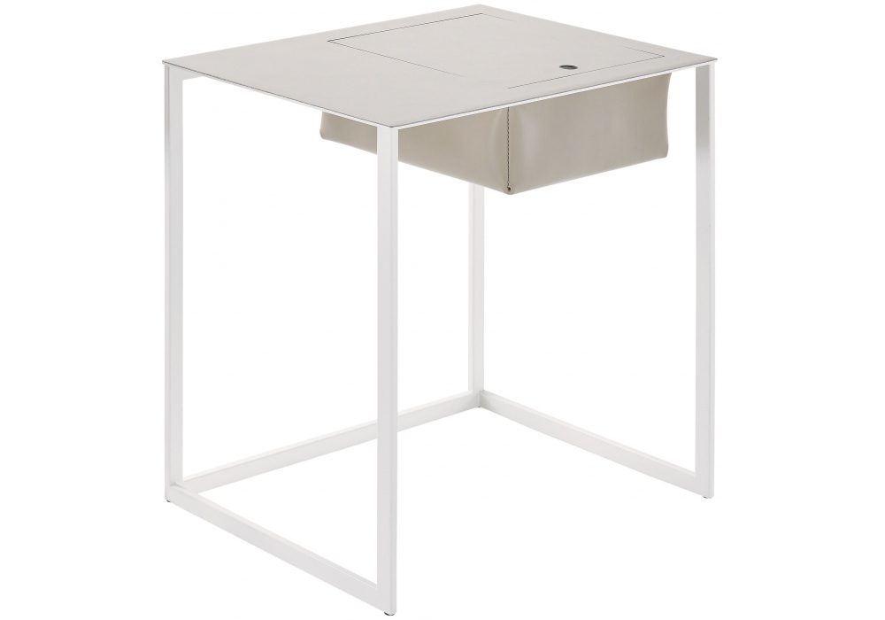 643 Taschino firmato da Gabriele Rosa per Zanotta è un comodino con cassetto. Struttura e piano in acciaio verniciato colore bianco, nero o grafite. Piano e vano portaoggetti in cuoio pigmentato 90. Il vano è accessibile mediante apertura a ribalta, ed è disponibile nella versione destra e sinistra.