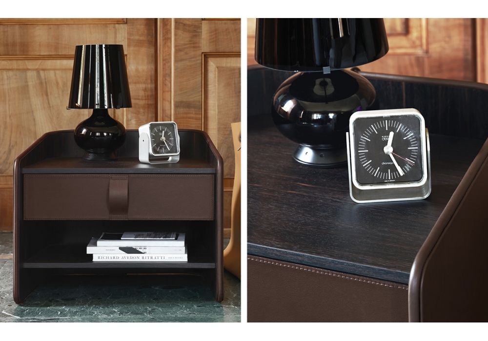 Gentleman firmato da Carlo Colombo per Flou è un comodino con struttura in legno multistrato di faggio curvato rivestito esternamente in pelle, internamente in ebano (finitura opaca). Frontale e maniglie in pelle. L'eleganza delle linee, la preziosità dei materiali e l'accuratezza delle lavorazioni esprimono appieno i valori del vero "Made in Italy". Disponibile anche in 3 diverse dimensioni.
