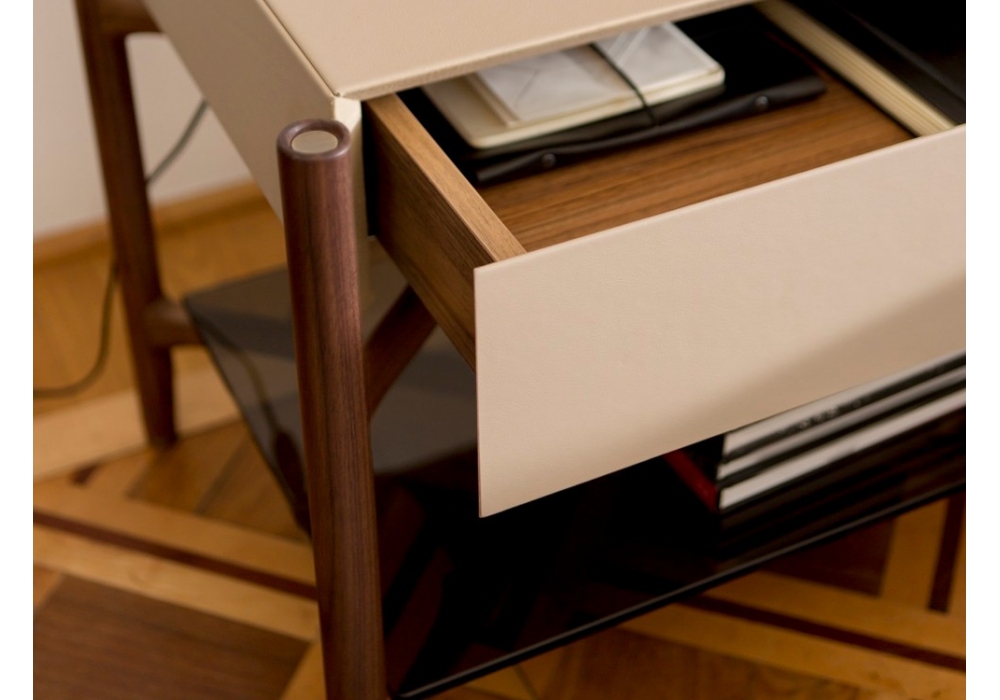 Regent 2 firmato da T. Colzani per Porada è un comodino con struttura in massello di noce canaletta. Il cassetto a chiusura rallentata è rivestito in pelle. Ripiano inferiore in cristallo fumé. Disponibile anche nella versione con cassetto in legno.