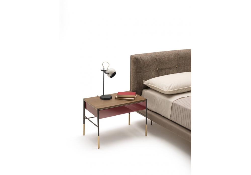 Era firmato da David Lopez Quincoces per Living Divani è un comodino con gambe in acciaio, piedini in ottone, cassetto in MDF verniciato lucido e piano in MDF impiallacciato in rovere o noce.