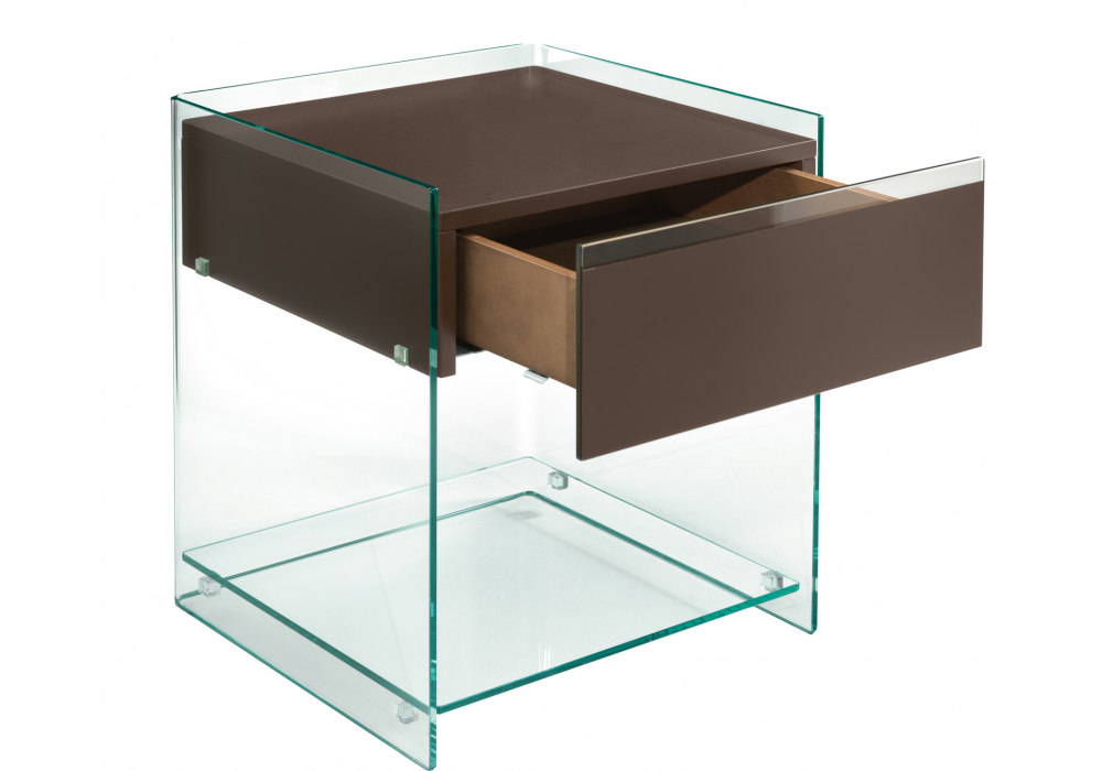 Dino firmato da CRS Fiam è un comodino con struttura in vetro curvato con cassetto realizzato in legno laccato in finitura bianca, nera o marrone-grey e frontalino in vetro in tinta. Su richiesta è disponibile con struttura in vetro extralight e cassetto bianco, vetro fumè e cassetto nero o vetro bronzo e cassetto marrone.