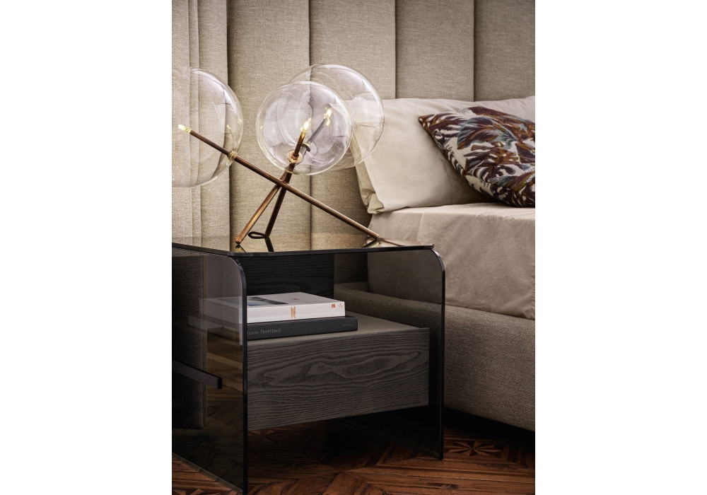 Holly firmato da Pinuccio Borgonovo per Gallotti&Radice è un comodino con un cassetto. Struttura in frassino tinto nero poro aperto oppure tinto grigio smoke. Cassetto montato su guide a estrazione totale. Piano superiore e fianchi in cristallo temperato fume’ “grigio Italia” oppure cristallo extralight 10 mm. Parti metalliche in alluminio spazzolato anodizzato nero. Dotato di piano superiore del cassetto in frassino tinto nero poro aperto oppure tinto grigio smoke come la struttura. Su richiesta disponibile in cristallo decorato Craquele’ oppure nella finitura Cashmere nei colori gold grey o anthracite.