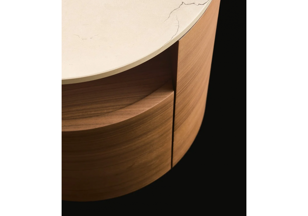 Onda firmato da R&D Poliform è un comodino con struttura in legno. Cassetti con maniglie in cuoio. Piano disponibile in laccato opaco, rivestito in cuoio o in marmo levigato/lucido.