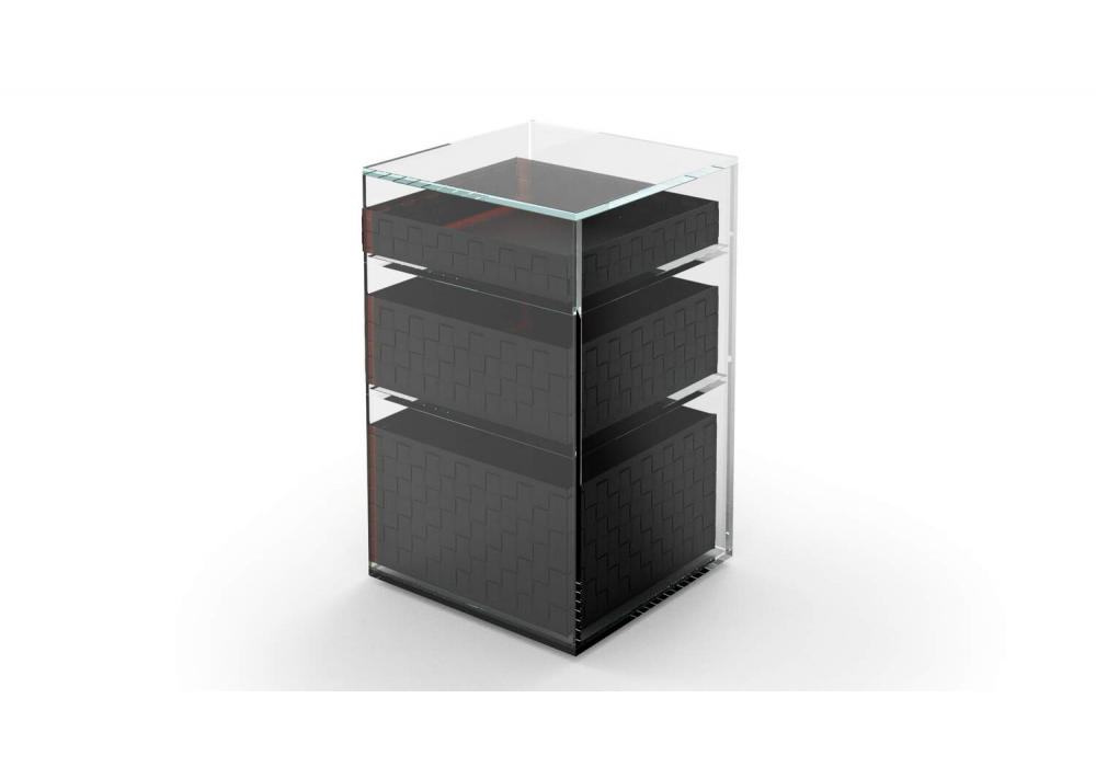 L29 Volage Ex-S Night firmato da Philippe Starck per Cassina è un comodino in vetro temperato extrachiaro o fumé con 3 scomparti. É possibile aggiungere dei cesti di diverse dimensioni in pelle o in midollino.