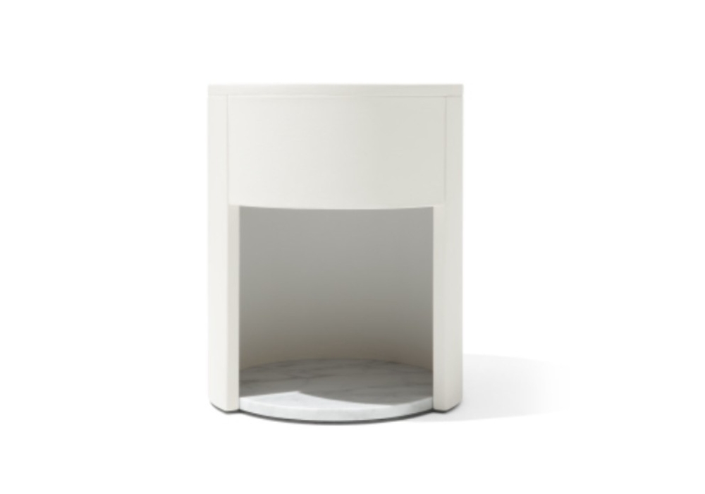 Side Vibe firmato da Carlo Colombo per Giorgetti è un comodino con struttura in multistrato curvato rivestito in pelle o pelle Plus con il piano superiore e quello inferiore disponibili in marmo o in noce canaletto, in diverse finiture. Il comodino è dotato di un cassetto con interni in sicomoro, con rivestimento esterno abbinato al resto della struttura.