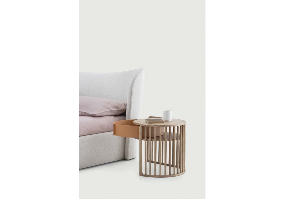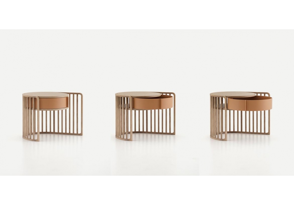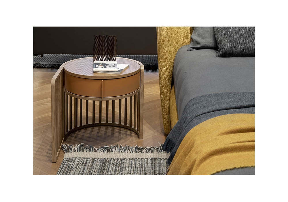 Palù firmato da Raffaella Mangiarotti per Pianca è un comodino realizzato con struttura in massello di noce Canaletto o frassino tinto. Cassetto rivestito in cuoio rigenerato con decoro in ottone lucido.