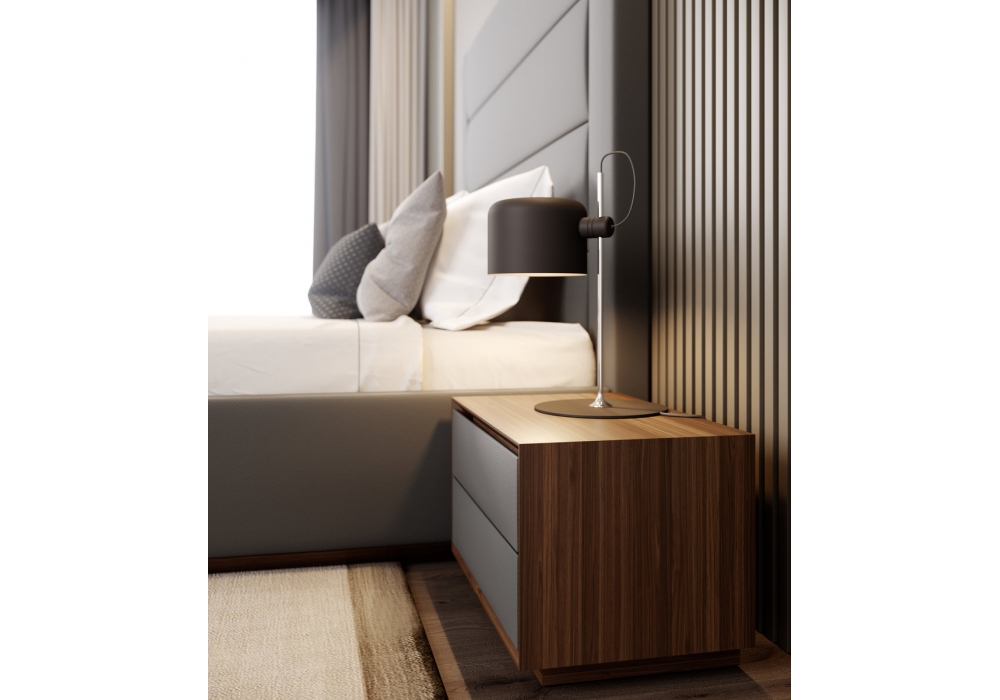 Amazon firmato da Christophe de Sousa per Gual Design è un comodino con struttura impiallacciata noce e frontali dei cassetti rivestiti in differenti tessuti.