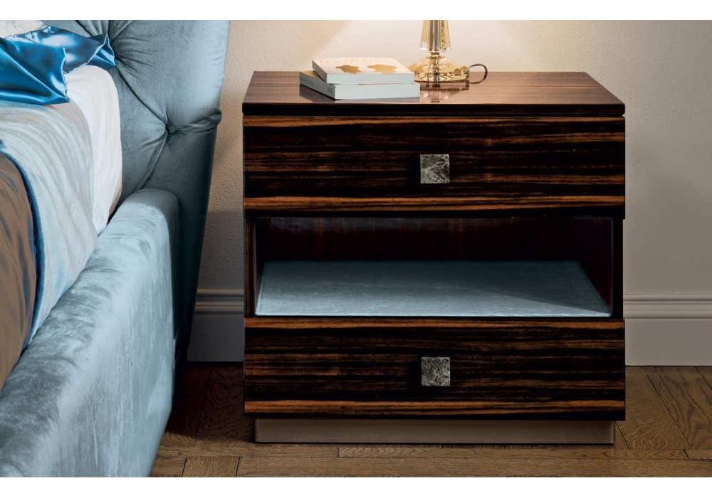 Phil firmato da Elle Studio per Longhi è un comodino con 2 cassetti con struttura in legno in essenza o laccato lucido. Vano centale con piano rivestito in pelle o velluto. Base verniciata bronzo e maniglie in marmo o cuoio.
