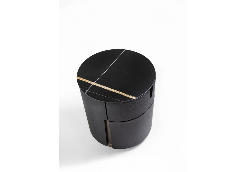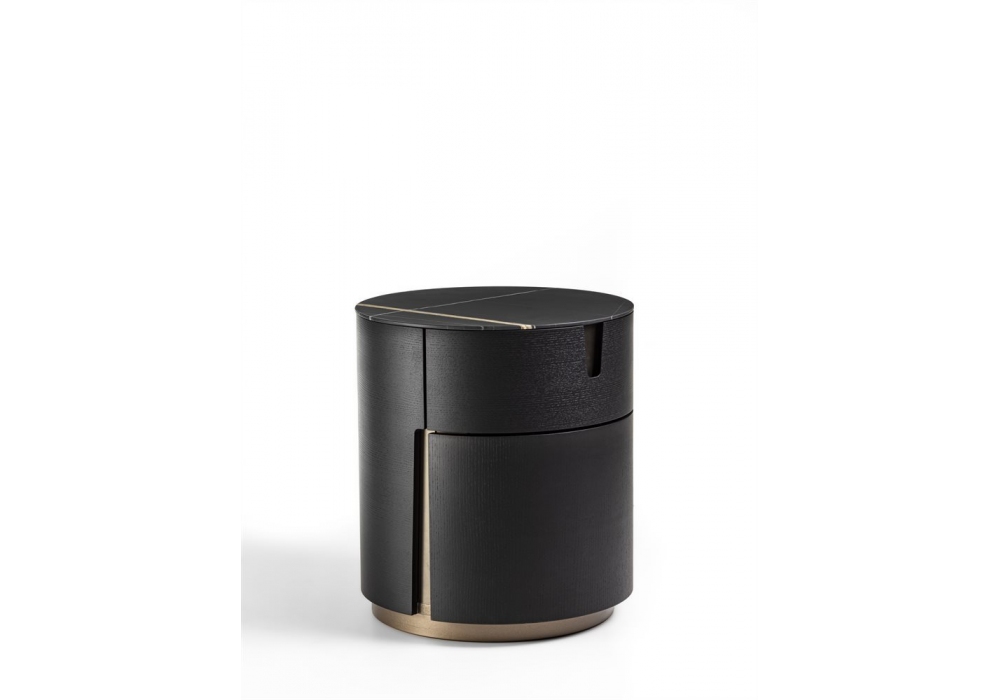 Tylsa Night 54 firmato da D. Radice per Porada è un comodino a due cassetti con struttura in frassino o in noce canaletta. Basamento in metallo in finitura Bronzoro e piano in legno o marmo. Maniglie incassate con fondo in metallo in finitura Bronzoro. Interno dei cassetti in finitura Titanio antigraffio.