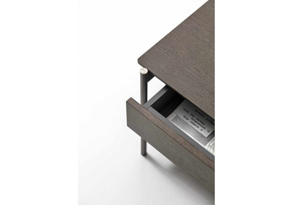 Erys firmato da Gabriele & Oscar Buratti per Ditre Italia è un comodino con struttura in metallo, piano e cassetto in legno. Disponibile in diverse finiture.