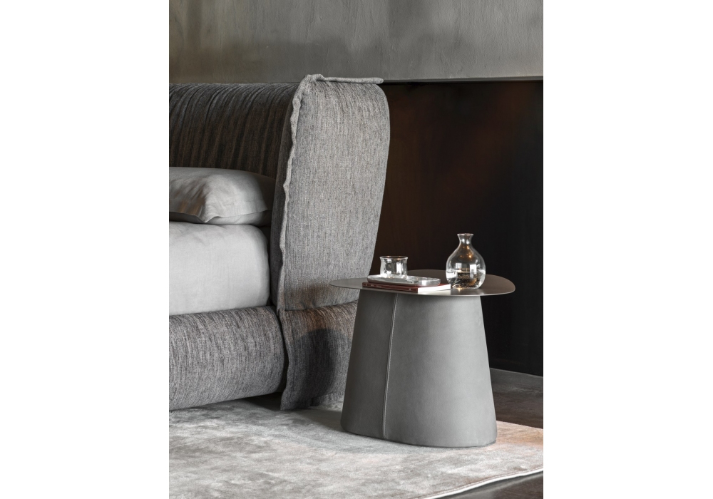 Puppet firmato da Stefano Spessotto per Ditre Italia è un comodino con struttura in legno rivestita in tessuto o pelle, piano in metallo nella finitura marrone chiaro.