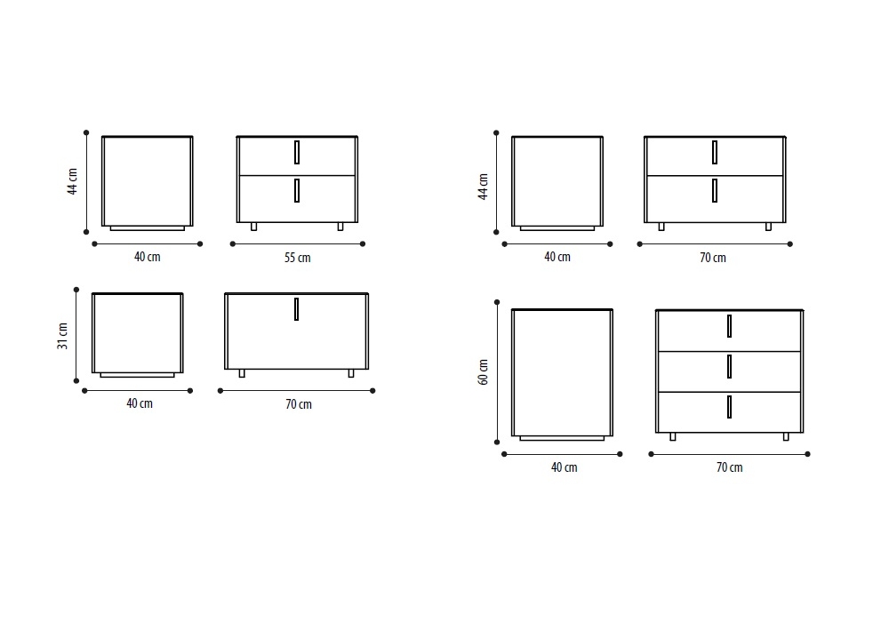 | Dimensioni | 55 x 40 x H 44 cm; 70 x 40 x H 31 cm; 70 x 40 x H 44 cm; 70 x 40 x H 60 cm. |