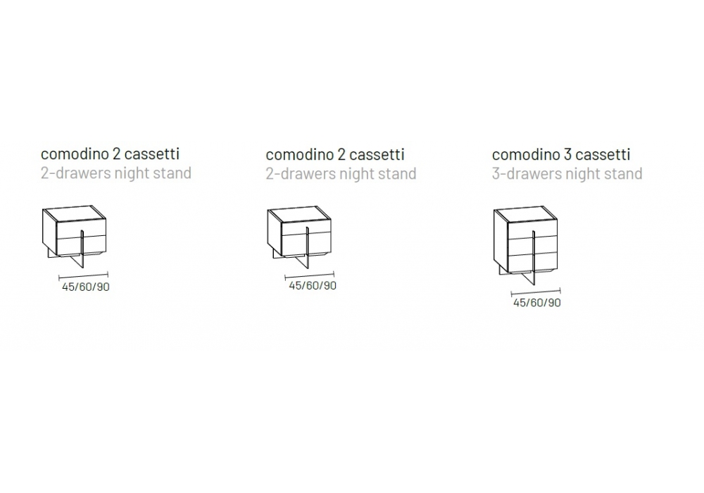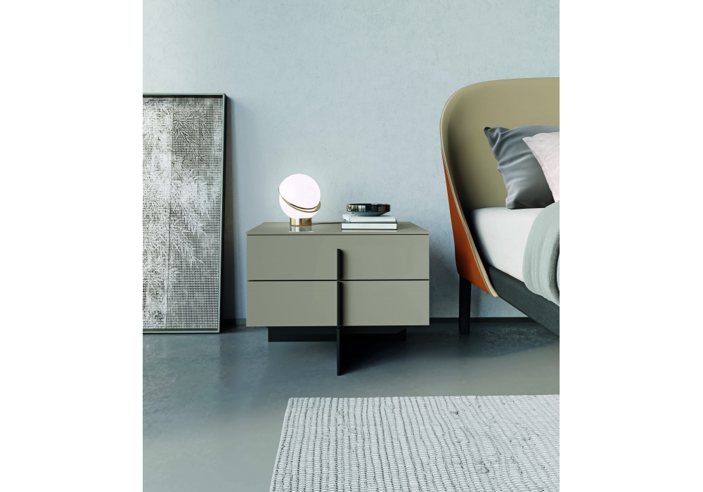 Katana firmato da Signorotto+Partners per Dall'Agnese è un comodino con struttura e frontali in pannelli di particelle di legno, disponibili in finiture melaminiche, laccate o impiallacciate. Top in gres dal taglio unico o in legno coordinato. Cassetti con chiusura ammortizzata Blumotion e fondo effetto pelle. Basamento e maniglie in metallo verniciato a polveri epossidiche.