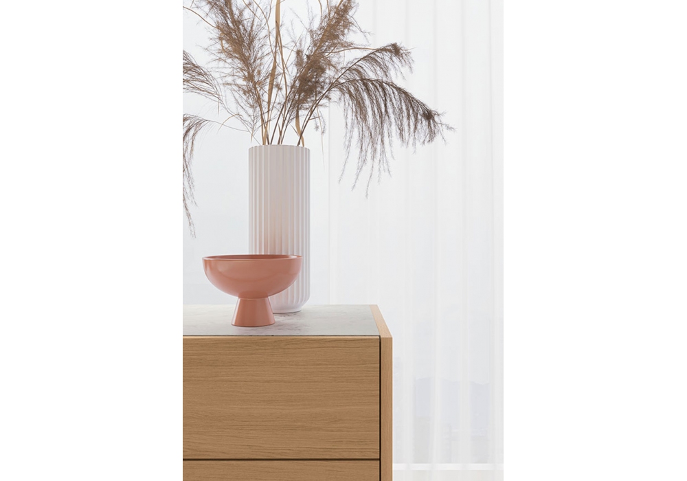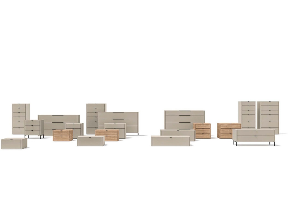 Filo firmata da Kico è una collezione di comò e comodini realizzati in pannelli di particelle di legno, con maniglie applicate disponibili in due varianti e possibilità di completamento con gambe dedicate.