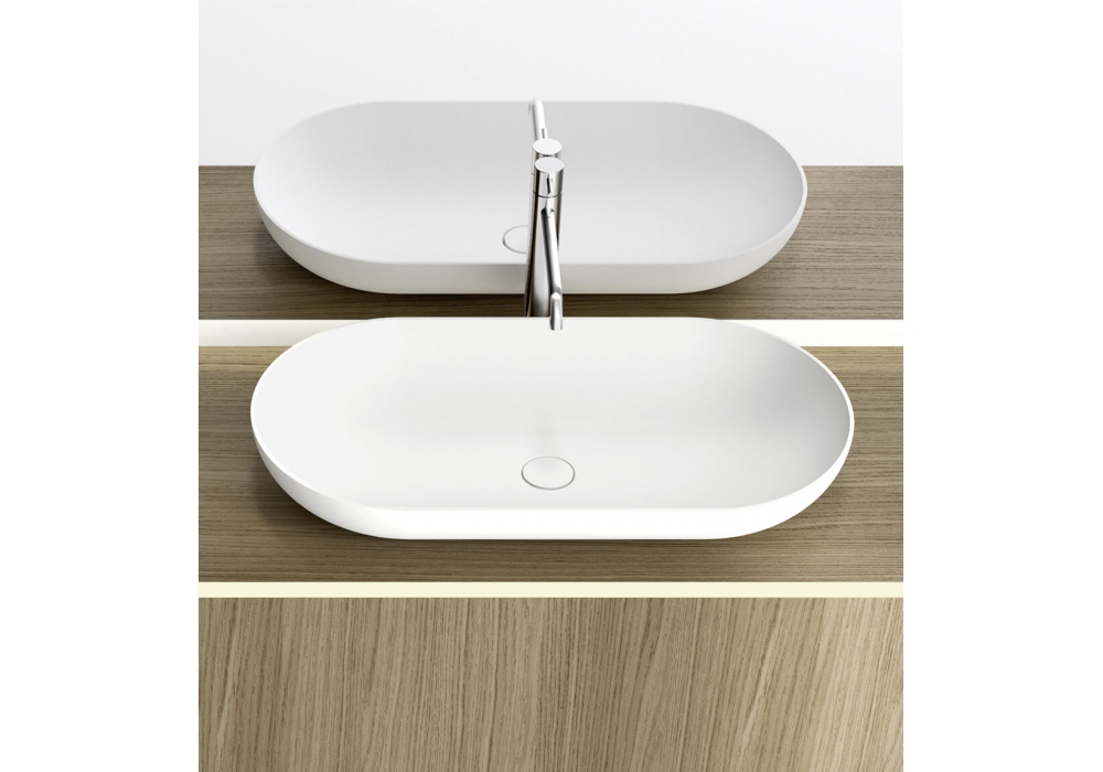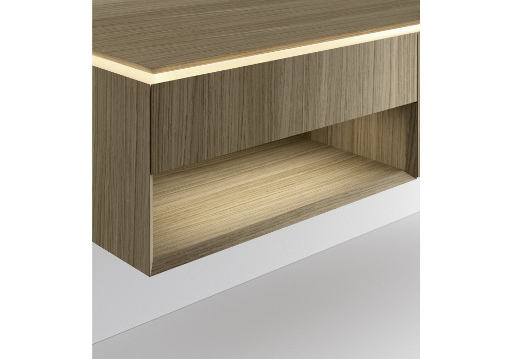 Puro 19.06 firmato da Michele Marcon per Noorth è un sistema bagno realizzato con lavabo in appoggio in cristalplant. Top, basi, vano a giorno e fianchi in rovere miele con illuminazione a LED inferiore. Specchiera con retroilluminazione a LED e rubinetteria in acciaio inox satinato.