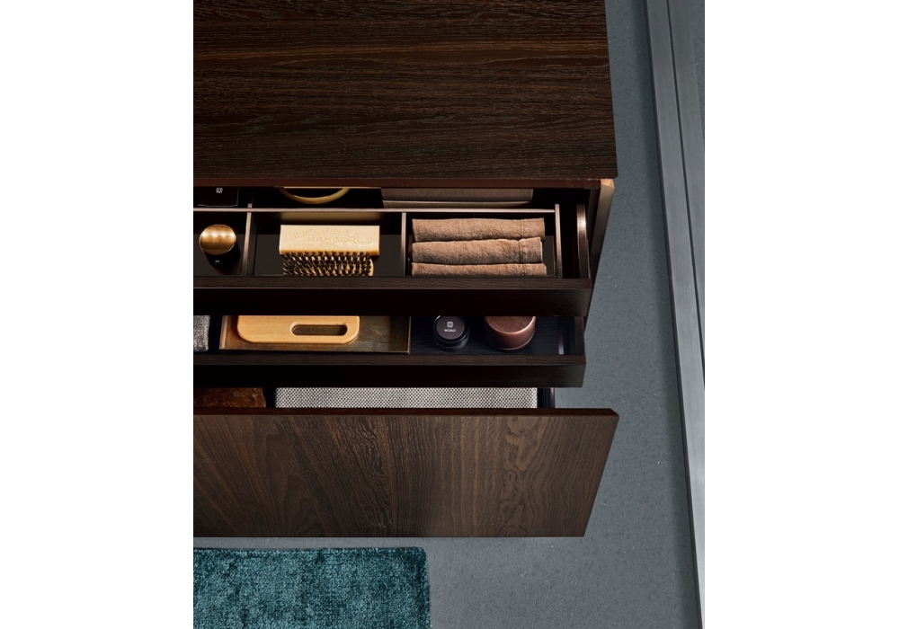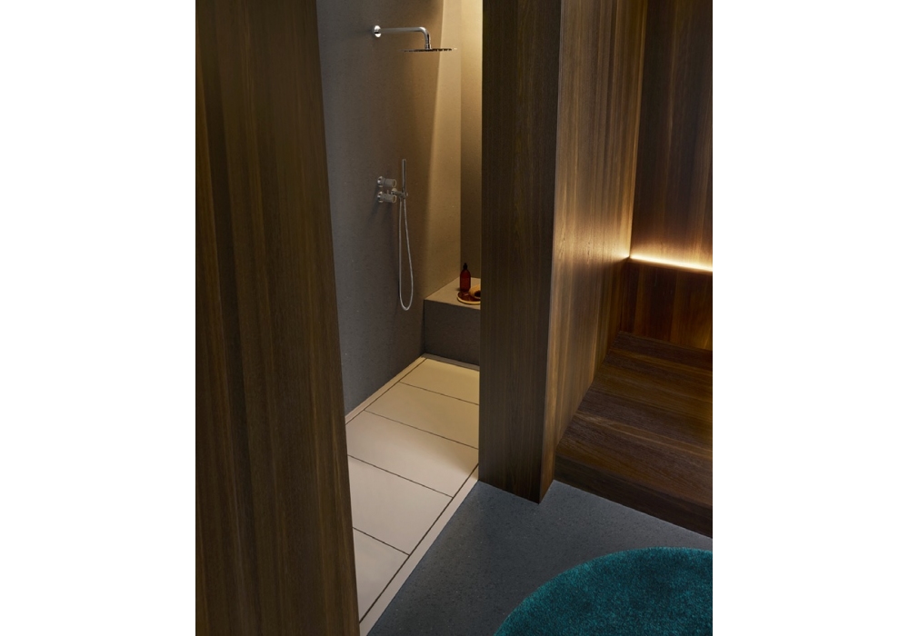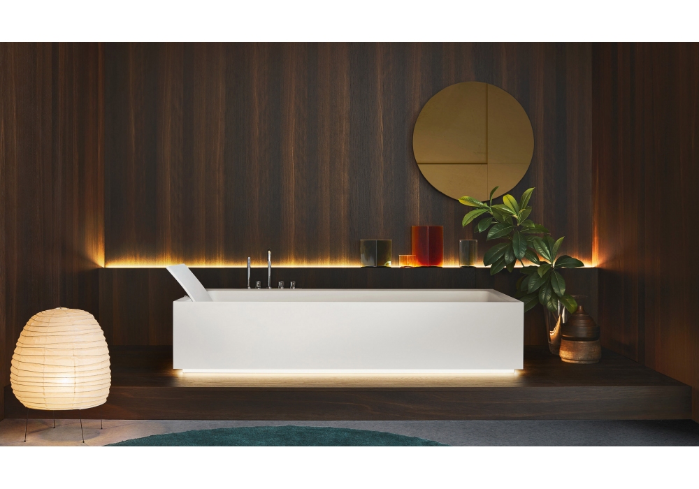 Puro 19.07 firmato da Michele Marcon per Noorth è un sistema bagno realizzato con lavabo in appoggio in cristalplant con illuminazione a LED inferiore. Top, basi e fianchi in rovere e zoccolo in laccato nero opaco. Specchiera a soffitto, vasca con schienale in milltek solid e illuminazione a LED. Boiserie e pedana in rovere, piatto doccia in milltek solid e sanitari in ceramica lucida.