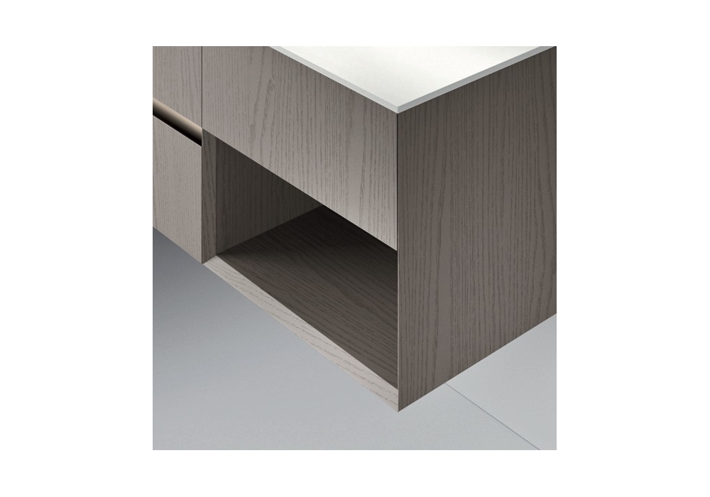 Zenit 19.02 firmato da Michelel Marcon per Noorth è un sistema bagno realizzato con top integrato in milltek solid, basi con gola centrale e vano a giorno in rovere. Specchiera con lampada a LED e rubinetteria in acciaio inox satinato.