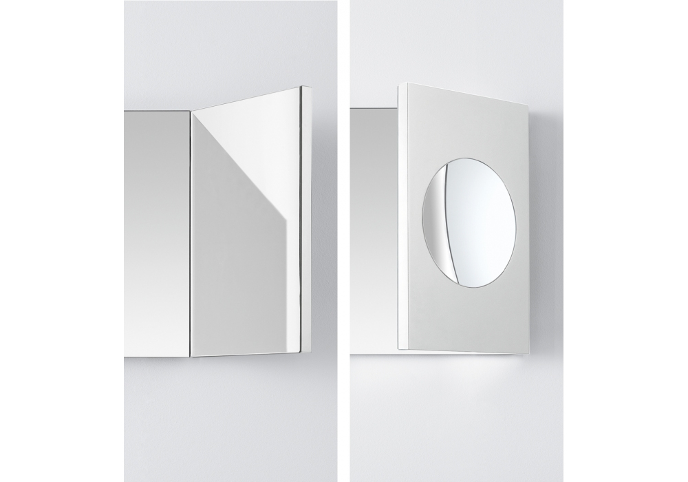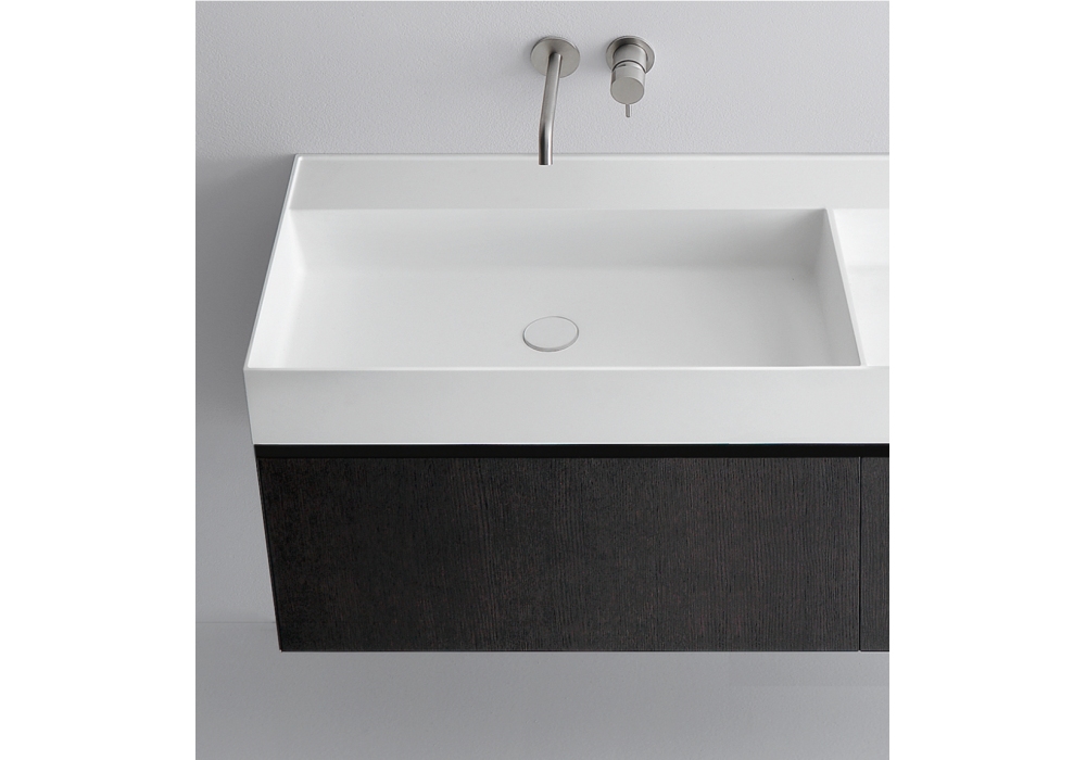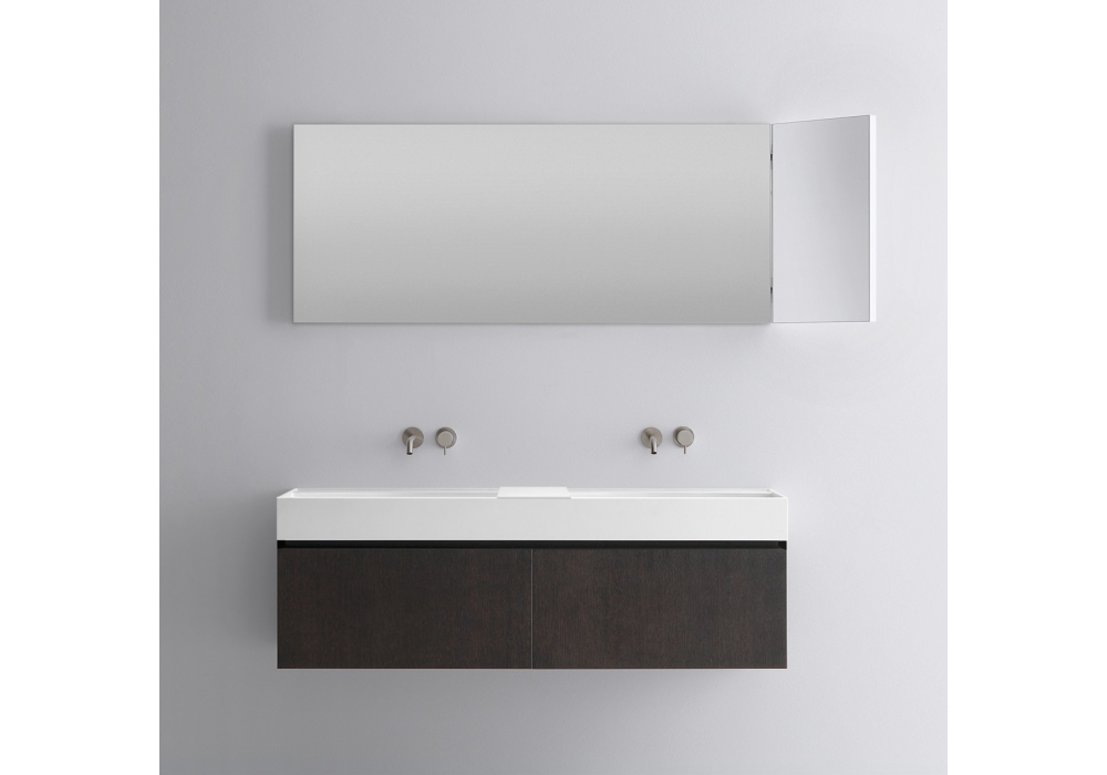Zenit 19.06 firmato da Michele Marcon per Noorth è un sistema bagno realizzato con base con gola superiore in rovere carbone con lavabo e vassoio in cristalplant. Specchiera con anta girevole in laccato bianco opaco e specchio ingranditore e rubinetteria in acciaio inox satinato.