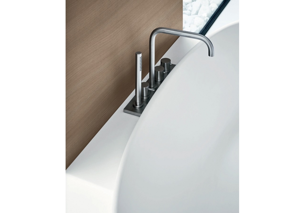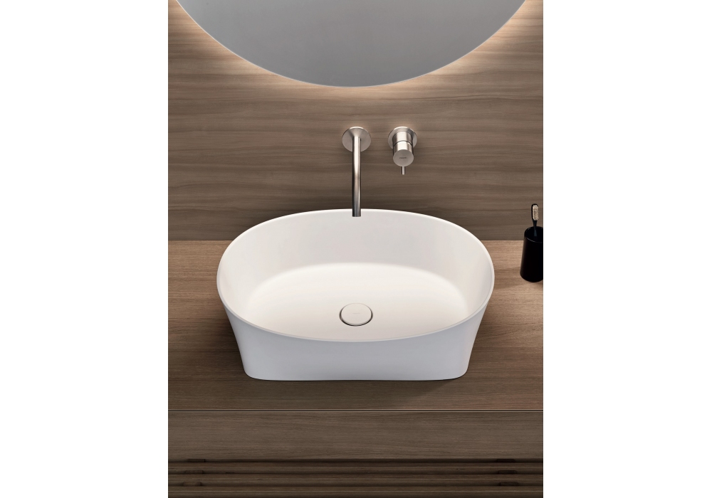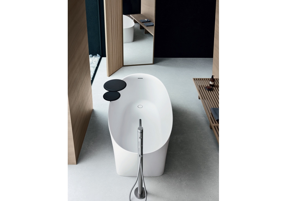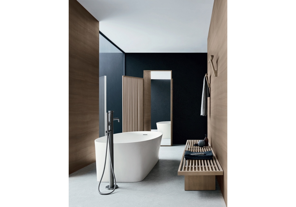 Azuma 19.01 firmato da Lievore Altherr per Noorth è un sistema bagno realizzato con lavabo in appoggio in cristalplant e top sospeso con cassetti e panca in rovere miele. Specchio con retroilluminazione a LED, vasca a parete con portarubinetti in cristalplant e vassoi in rovere carbone. Paravento a due ante a specchio e listelli in rovere miele o anta rivestita in tessuto. Sedia in rovere carbone, appendino a parete in rovere miele e pouff in sughero nero.